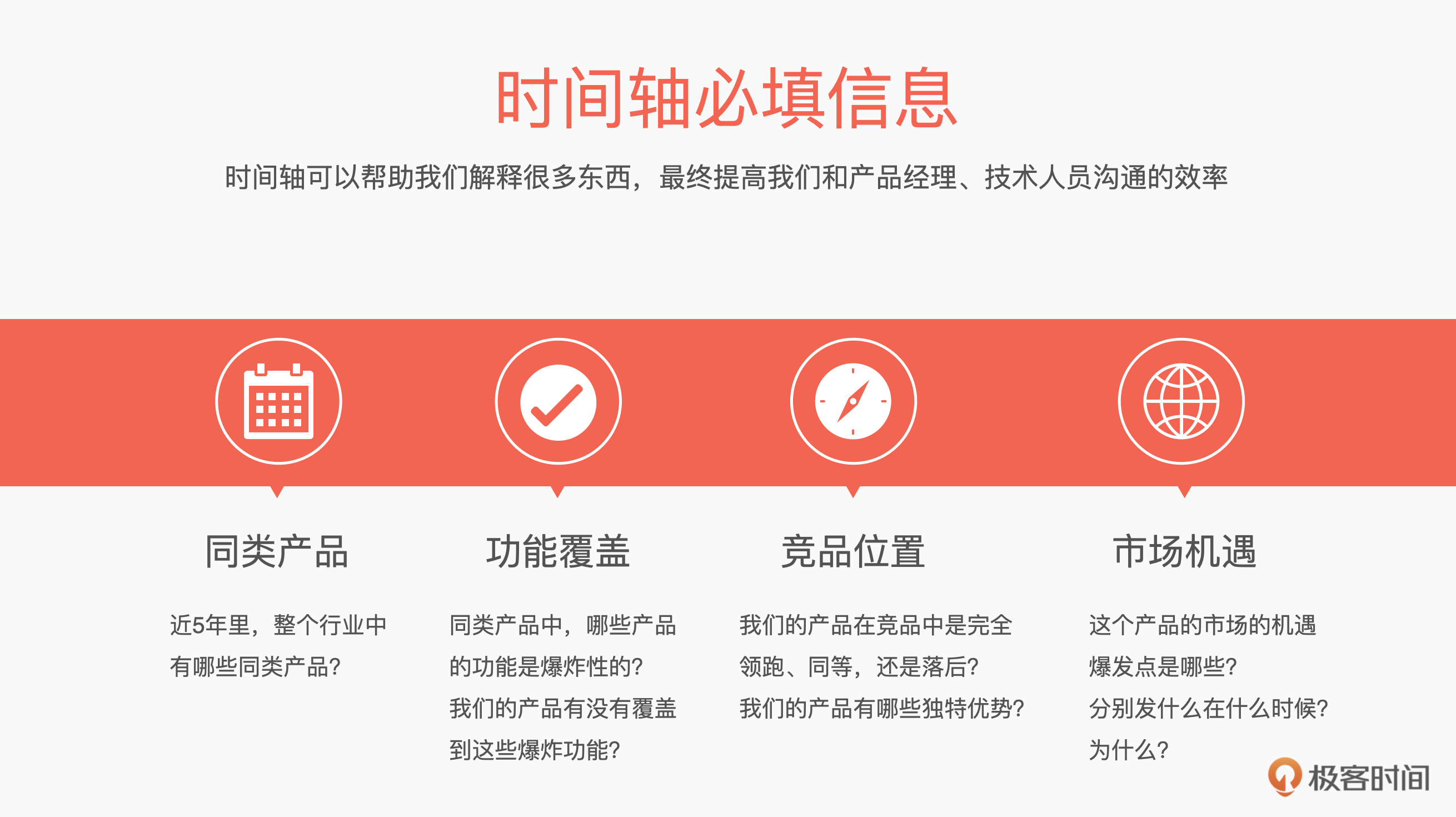 时间轴可以帮助我们理解很多东西,最终提高我们和产品经理、技术人员沟通的效率。这个时间轴的跨度大概在5~10年。现在,假设我们的极客云推出了一个企业级沟通产品——极客×信。我们就以这个极客×信为例,给你讲讲这个时间轴上有哪些必填的信息。