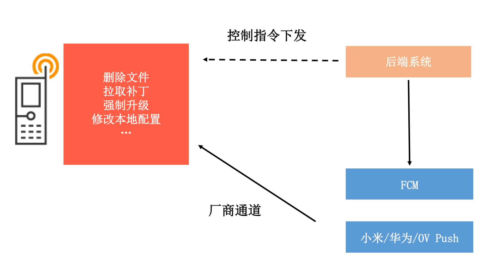 - 远程控制。在应用中,我们还需要保留一条“救命”的指令通道。通过这条通道,可以执行删除某些文件、拉取补丁、修改某些配置等操作。但是为了避免自有通道失效,这个控制指令需要同时支持厂商通道,例如某个下发资源导致应用启动后界面白屏,这个时候我们可以通过下发指令去删除有问题的资源文件。