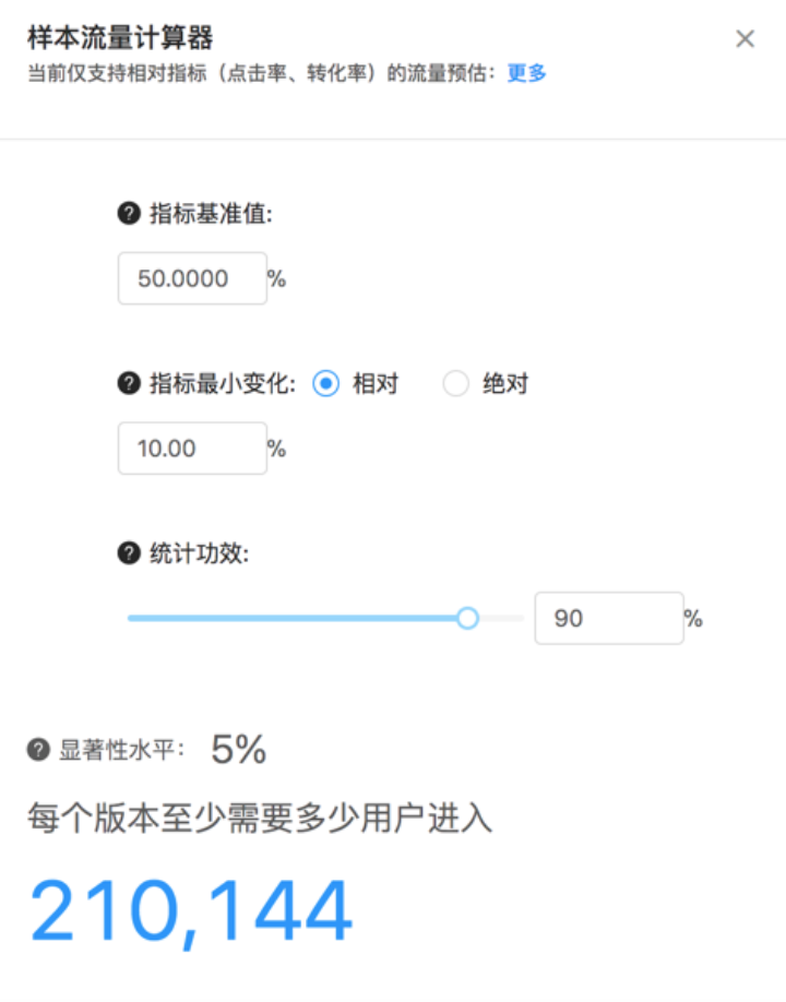 指标最小相对变化:请输入你认为有意义的最小相对变动值。假设你将要优化的指标为10%时,你在最小相对变化中输入5%, 就意味着你认为绝对值变化在(9.5%, 10.5%)之间的变动没有意义,即便此时测试版本更优,你也不会采用。