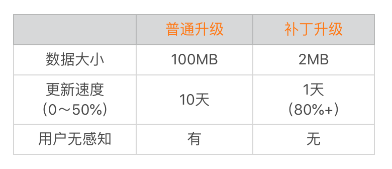 - 可回退。当补丁出现重大问题的时候,可以及时回退补丁,让用户回到基础版本,尽可能降低损失。