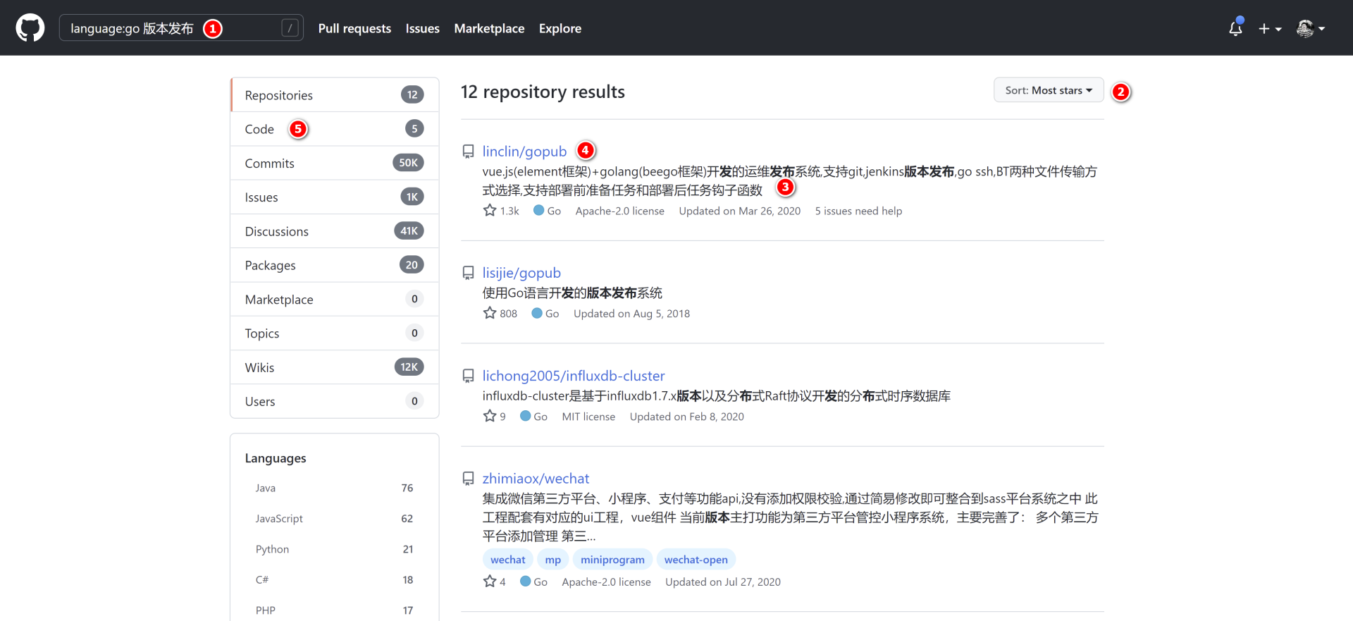 language:go 版本发布中,language:go说明我们要搜索语言类型为Go语言的项目;版本发布是我们搜索项目时的关键词。这个关键词对搜索结果影响很大,需要你合理填写。这里有个技巧,如果搜索版本发布,搜索出的项目很少,那么可以减少关键词再次搜索,比如搜索发布。 - GitHub搜索页面的