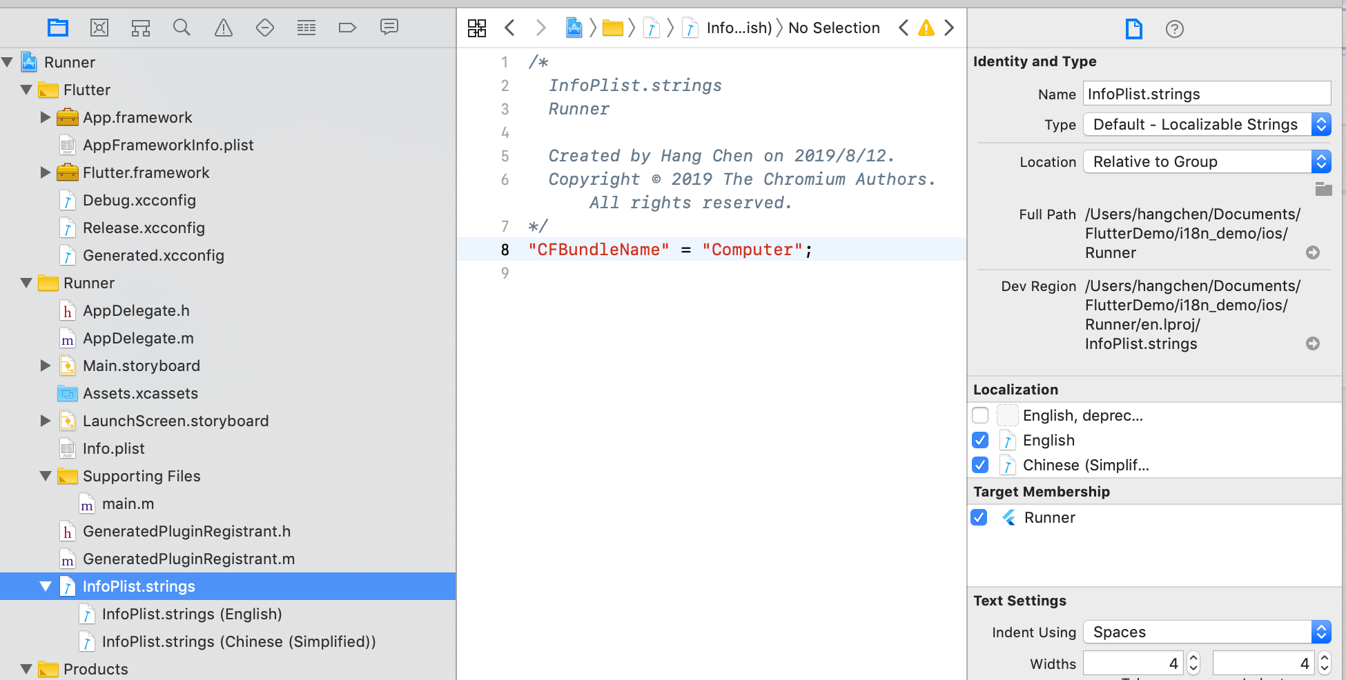 我们右键单击Runner文件夹,然后选择New File来添加名为InfoPlist.strings的字符串资源文件,并在工程面板的最右侧文件检查器中的Localization选项中,添加英文和中文两种语言。InfoPlist.strings的英文版和中文版内容如下所示: