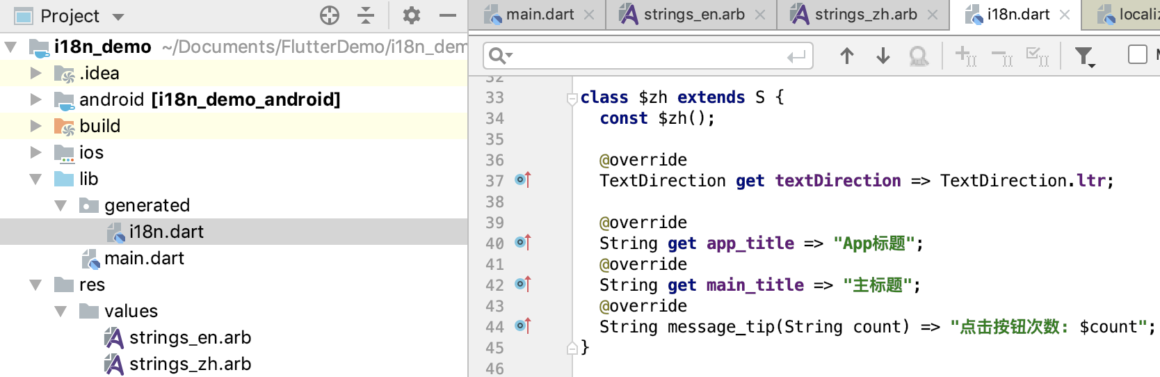 我们把strings_en.arb继续补全,提供英文版的文案。需要注意的是,i18n.dart是由插件自动生成的,每次arb文件有新的变更都会自动更新,所以切忌手动编辑这个文件。