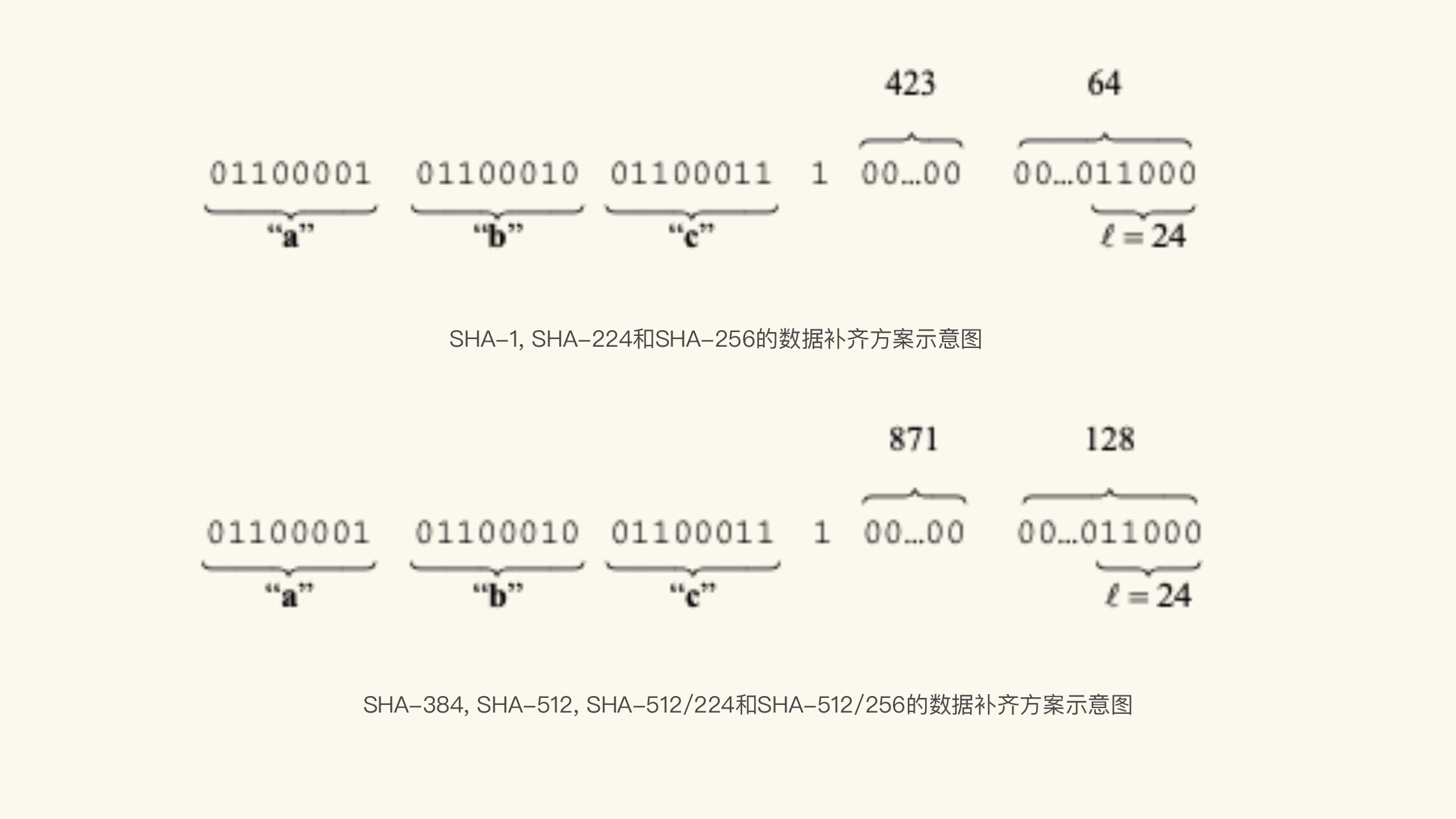 在下图SHA-1和SHA-2的数据补齐方案里,输入数据长度是补充数据的一部分。其中,SHA-1、SHA-224、SHA-256使用64位来表示输入数据长度;SHA-384、SHA-512、 SHA-512/224和 SHA-512/256使用128位来表示输入数据长度。