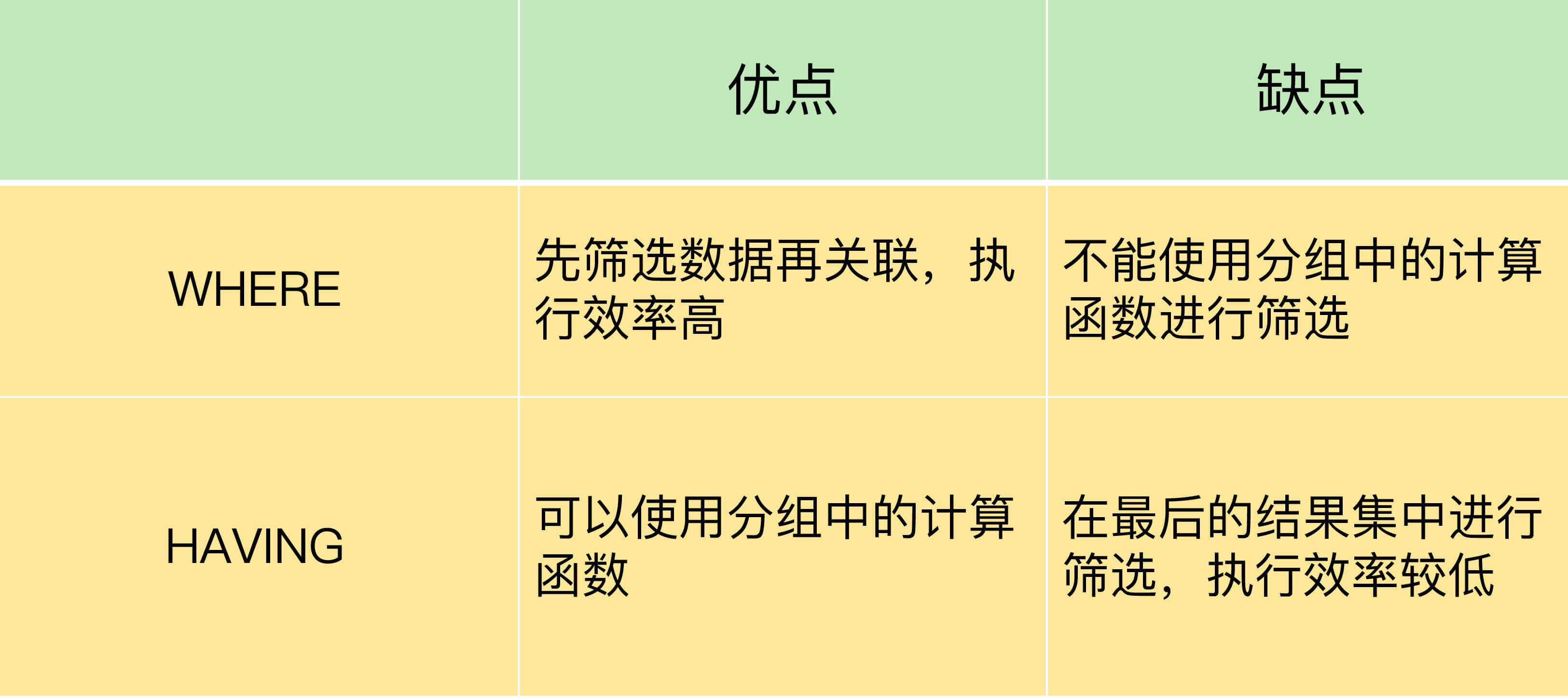我汇总了WHERE和HAVING各自的优缺点,如下图所示: