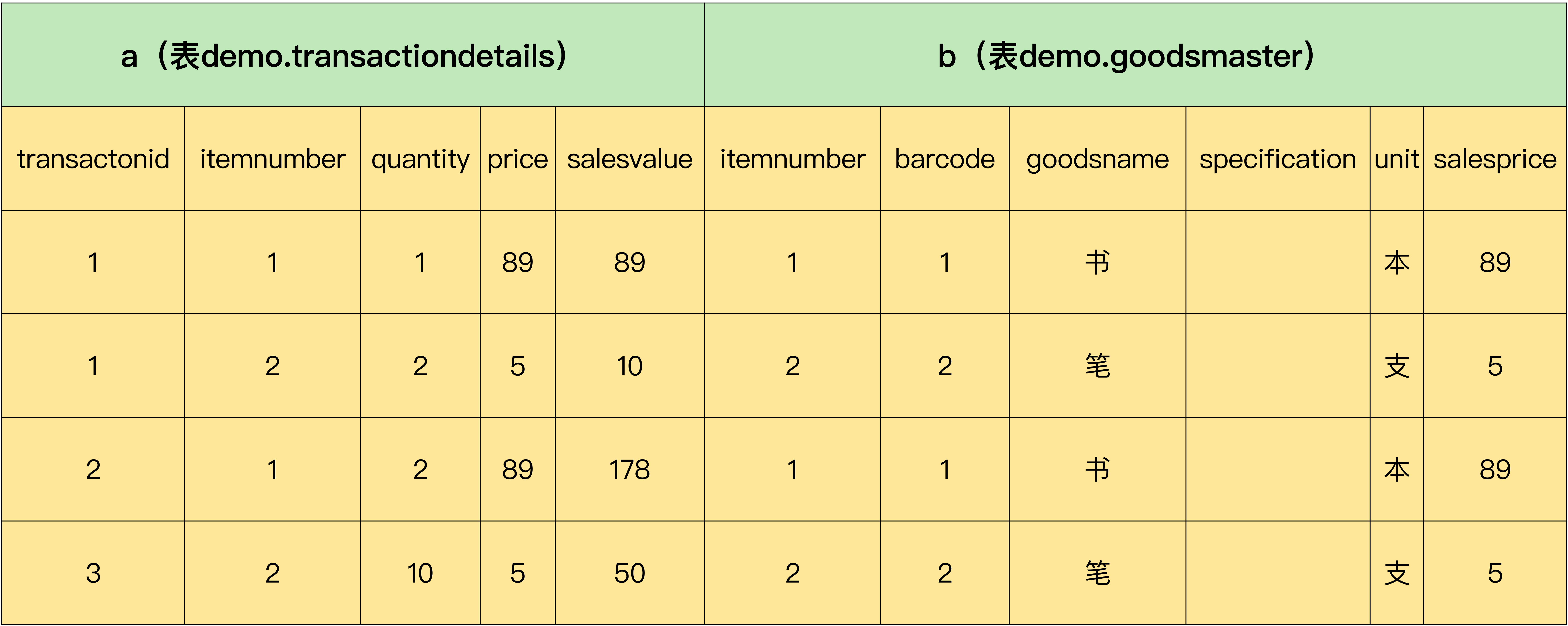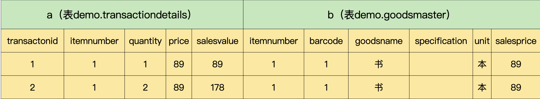 1 2 3 4 5 6 7 8 9 10 11 12 13 14 15 16 mysql> SELECT -> a.*, b.* -> FROM -> demo.transactiondetails a -> JOIN -> demo.goodsmaster b ON (a.itemnumber = b.itemnumber); +---------------+------------+----------+-------+------------+------------+---------+-----------+---------------+------+------------+ | transactionid | itemnumber | quantity | price | salesvalue | itemnumber | barcode | goodsname | specification | unit | salesprice | +---------------+------------+----------+-------+------------+------------+---------+-----------+---------------+------+------------+ | 1 | 1 | 1.000 | 89.00 | 89.00 | 1 | 0001 | 书 | NULL | 本 | 89.00 | | 1 | 2 | 2.000 | 5.00 | 10.00 | 2 | 0002 | 笔 | NULL | 支 | 5.00 | | 2 | 1 | 2.000 | 89.00 | 178.00 | 1 | 0001 | 书 | NULL | 本 | 89.00 | | 3 | 2 | 10.000 | 5.00 | 50.00 | 2 | 0002 | 笔 | NULL | 支 | 5.00 | +---------------+------------+----------+-------+------------+------------+---------+-----------+---------------+------+------------+ 4 rows in set (0.00 sec)