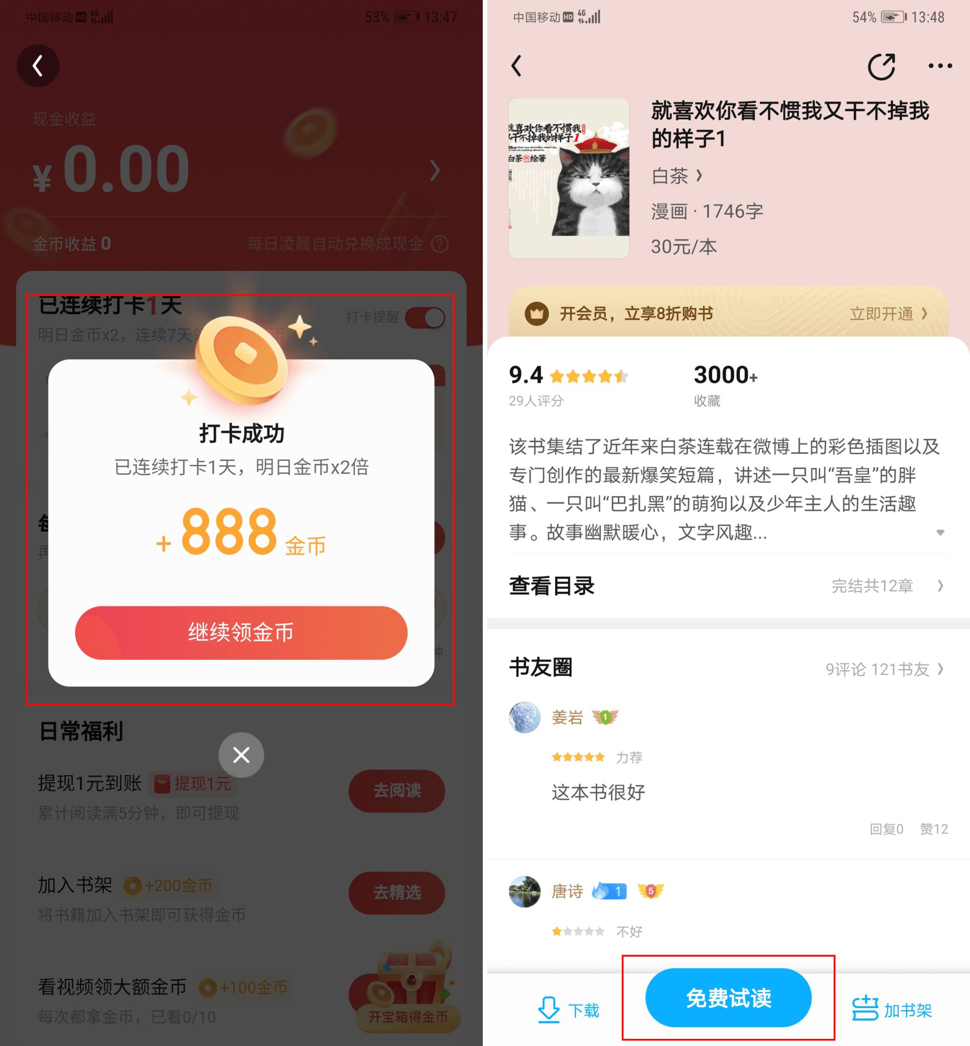 下面这个QQ阅读的例子里,从第一次登录奖励金币,到免费试读5分钟后引导注册会员,就是一个典型的App设计时对互惠原则的运用。当然,消费者容易分辨什么是恩惠,什么是诡计。套路太多,用户也在吃亏中成长。只有真诚才能换得真心,触发用户的人情债或愧疚感,才能真正钓到大鱼。