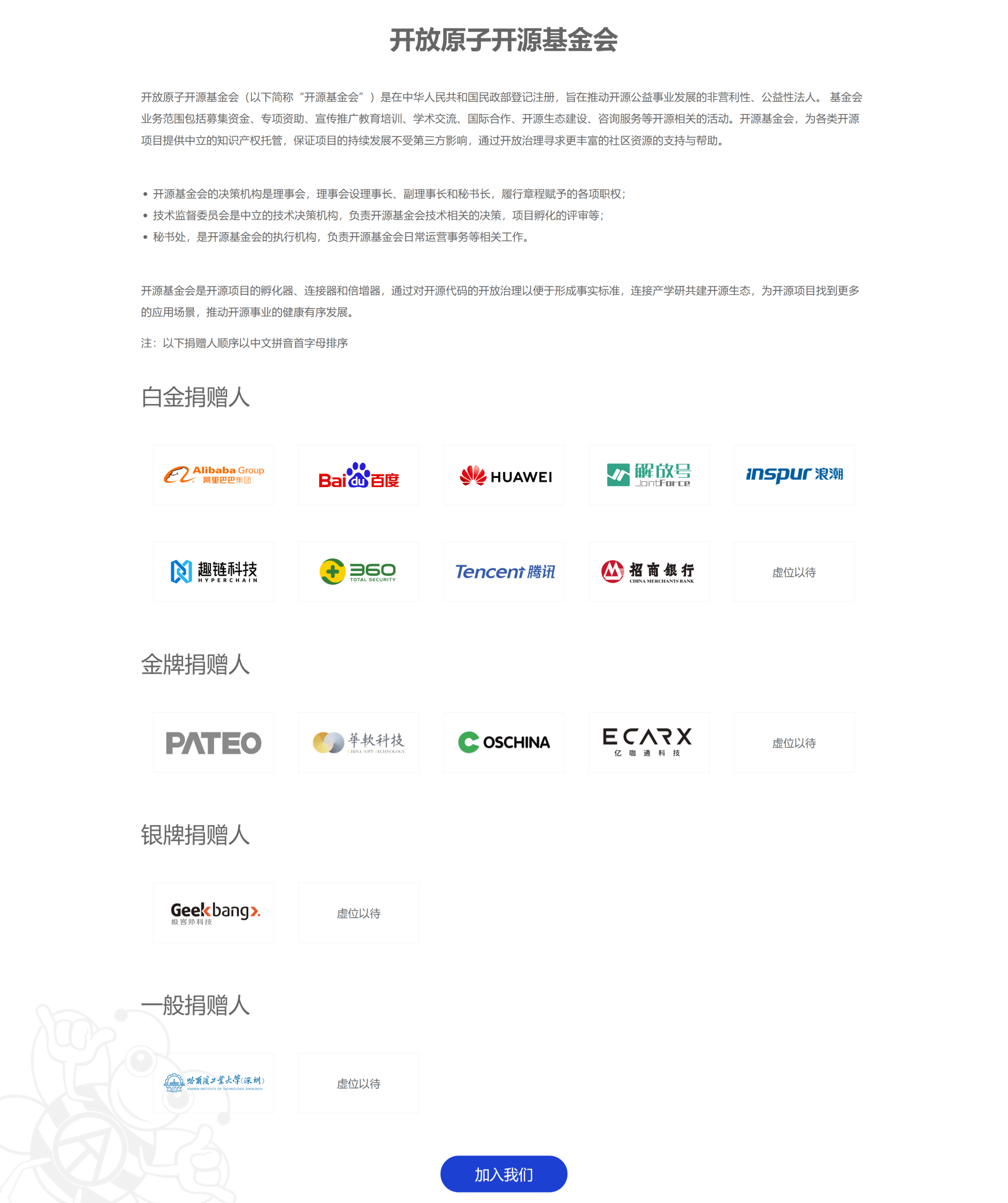 比如下面开放原子开源基金会网站在捐助人和名人堂的介绍上,就运用了权威性原则。对于一个公益机构而言,在官网和公众号的媒体平台上及时曝光合作伙伴,是一种非常好的双赢设计点。
