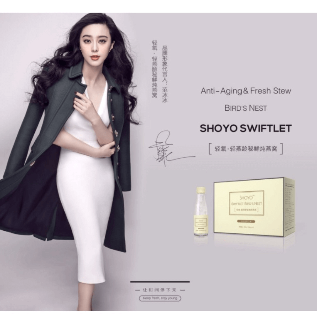- 通过明星代言从而让粉丝们爱屋及乌的方式。这种方式叫光晕效应或者名人效应。名人效应在广告、海报等创意设计中大量使用。但用好也不容易。整体的风格、话术、场景、音乐的设计,都要和名人的特点、气质保持一致才能有共振效果。比如下面海报的整体氛围营造上,通过皮肤的吹弹可破去强化燕窝的冻龄作用。