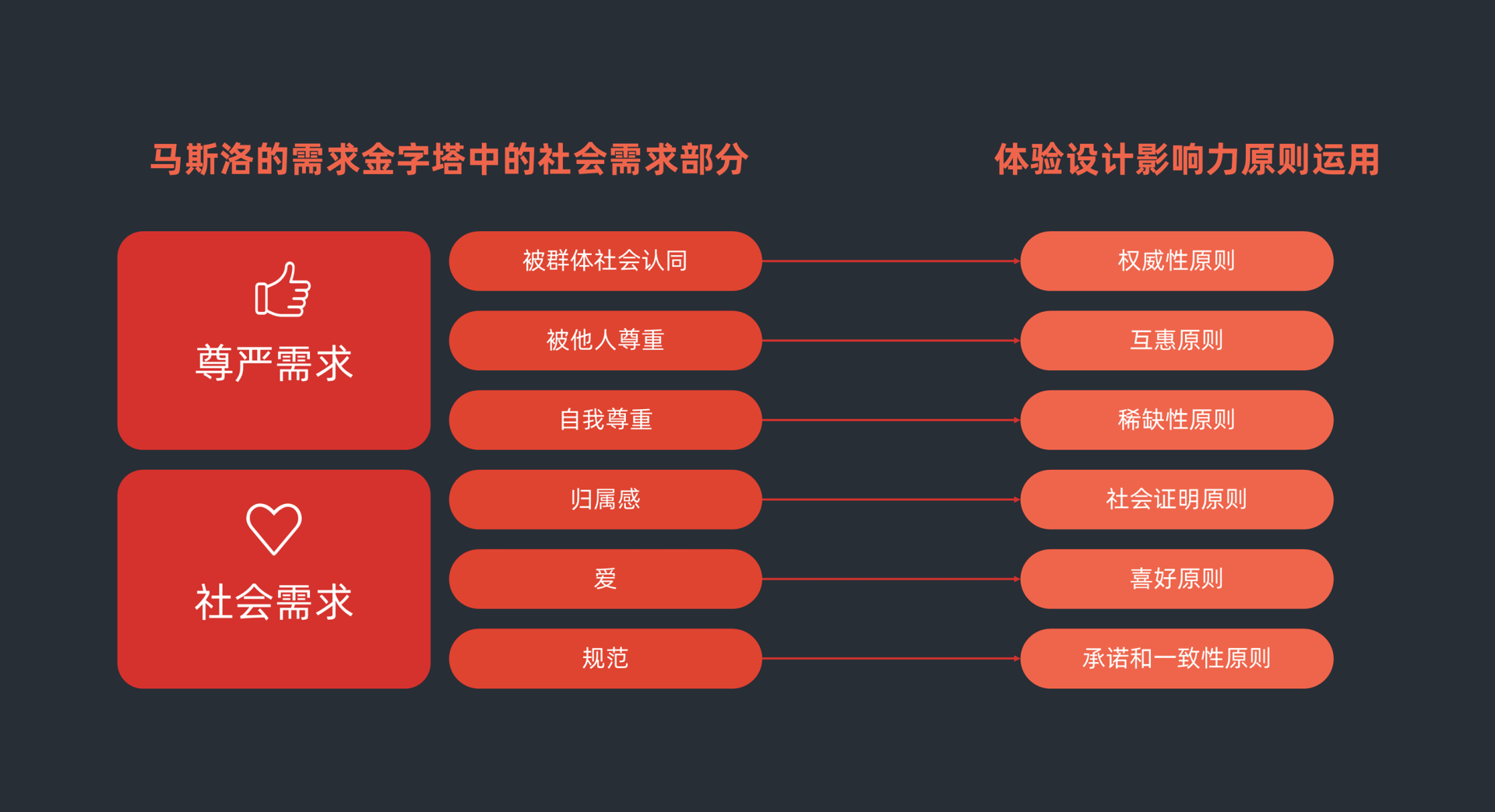 在设计中要理解人的社会属性,我们首先从理解马斯洛需求金字塔中的社会需求开始。六个影响力原则是针对第三层的社会需求(规范、爱和归属感)以及第四层尊严需求(自我尊重、被他人尊重和社会群体认同),分别给出不同的设计原则来满足人的社会属性,从而达到更好的用户体验。具体来说6个原则如下: