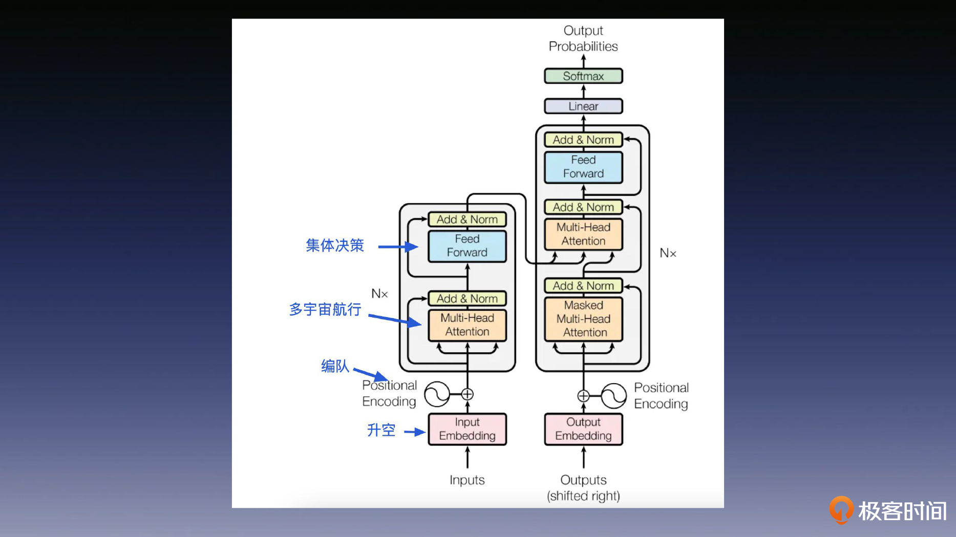 你可以对照后面的图来加深理解。是不是现在已经对 Transformer 各个部分的作用一目了然了?