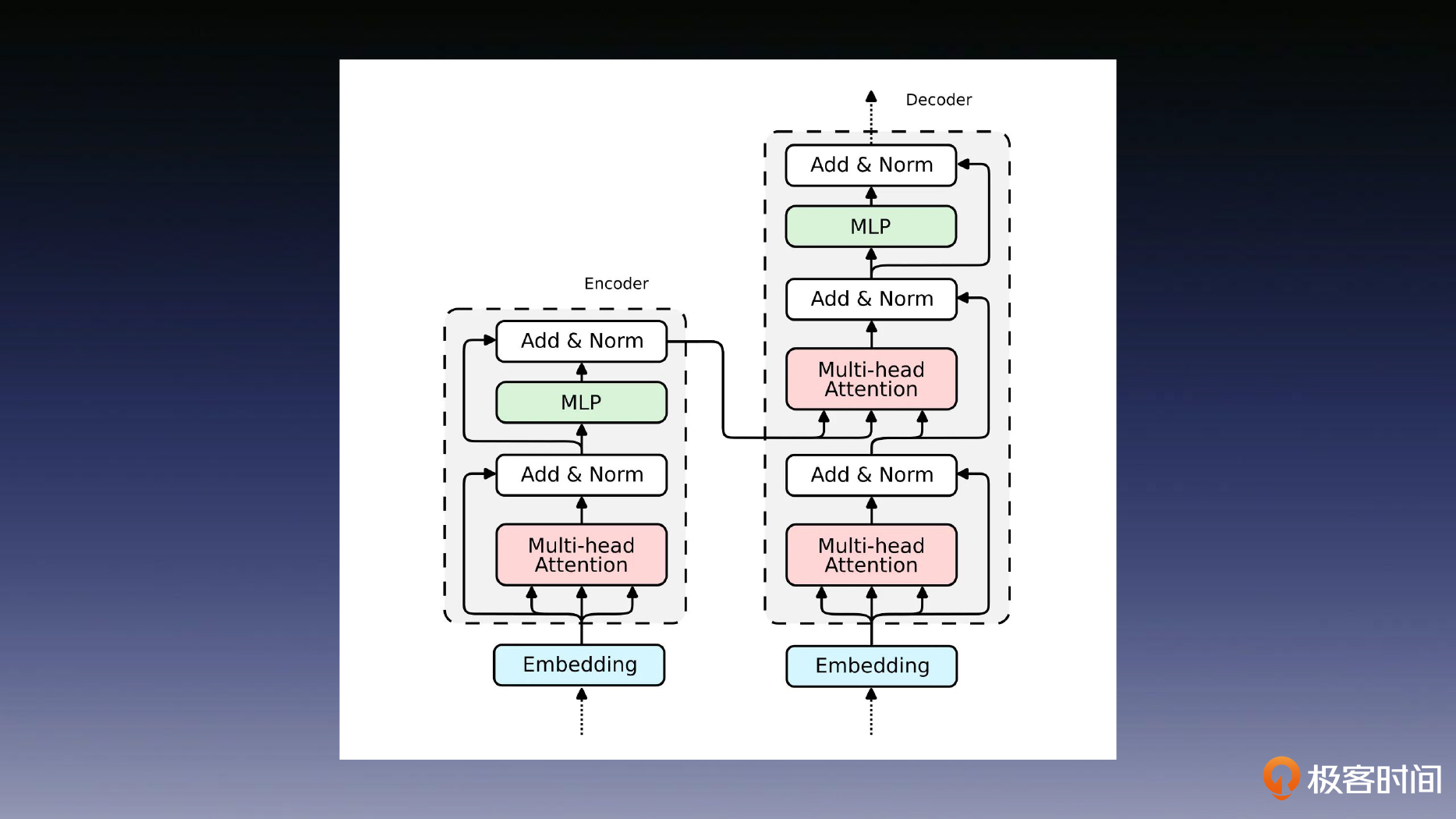 因此这节课,我就会带你啃下这个 Transformer 这个硬骨头,不过请放心,它的原理其实并不复杂。但想要理解它,请务必确保你已经认真学习了[第12节课]的内容,深入理解上节课提到的 Seq2Seq 架构以及编码器和解码器的作用。