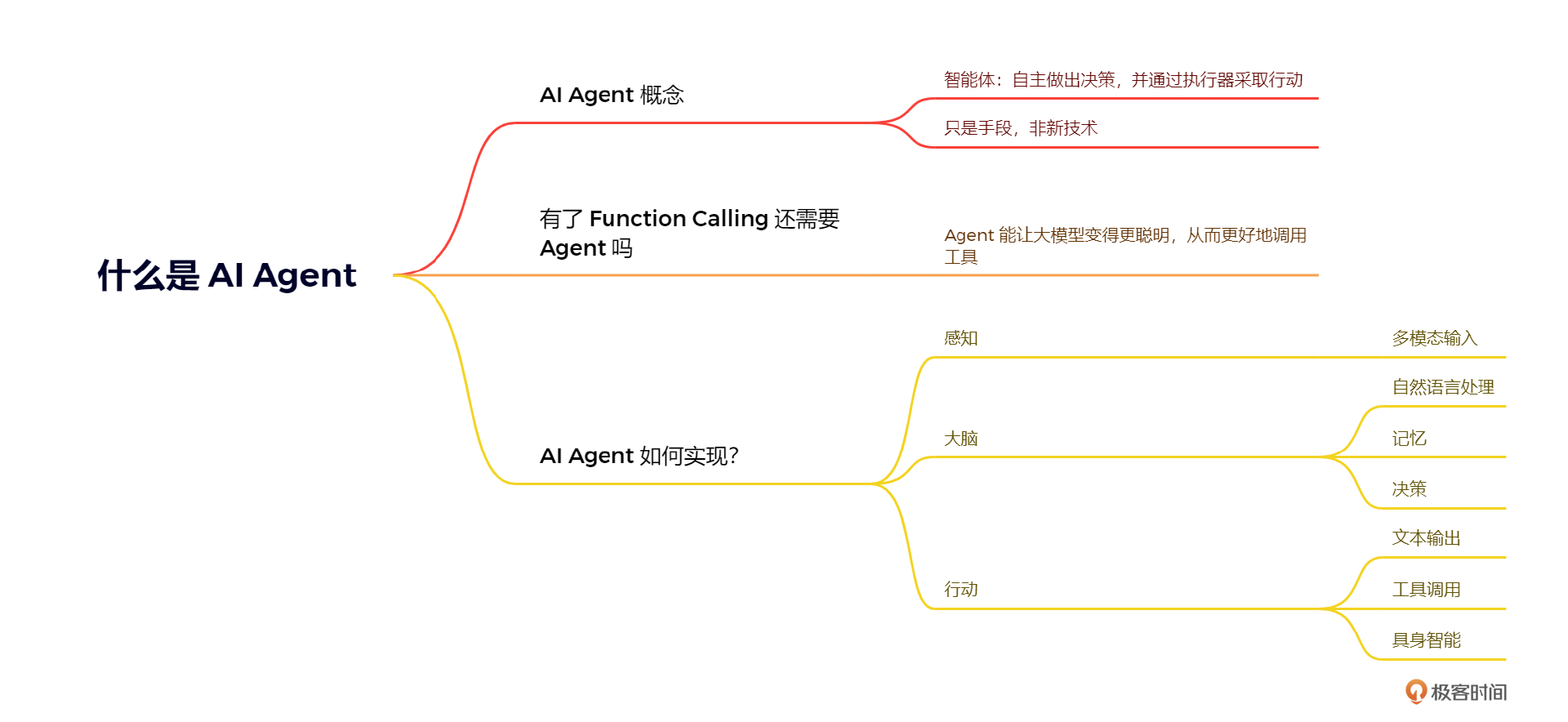 在上节课中,我们详细讨论了 Function Calling 的技术背景和功能,并用一个小例子带你体验了大模型通过工具与外界交互的能力。这节课,我将沿着上节课的脚步,探讨一下,AI Agent 是什么,有了 Function Calling 为什么还需要 Agent?