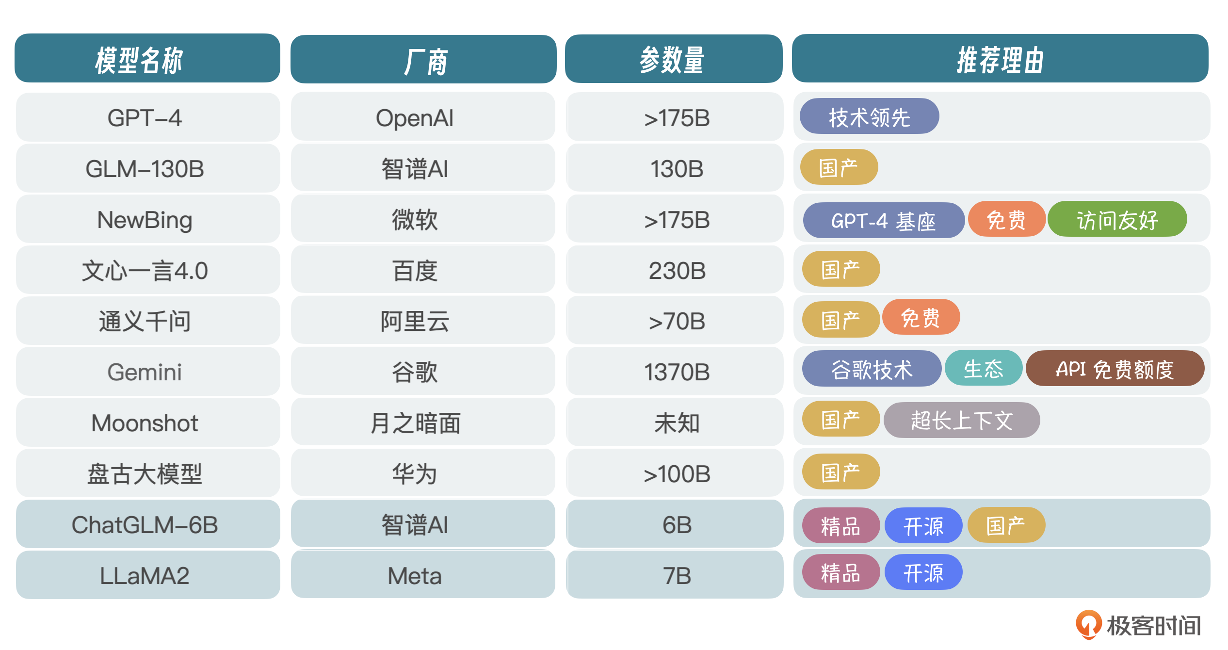 当前环境下,大模型百花齐放。我筛选出了一些核心玩家,你可以看一下表格。非核心的其实还有很多,这里我就不一一列举了。厂商虽然很多,但真正在研究技术的没多少,毕竟前面我们讲过,玩大模型投入非常大,光看得见的成本,包括人才、训练和硬件费用,一年就得投入几个亿,不是一般玩家能玩得起的。