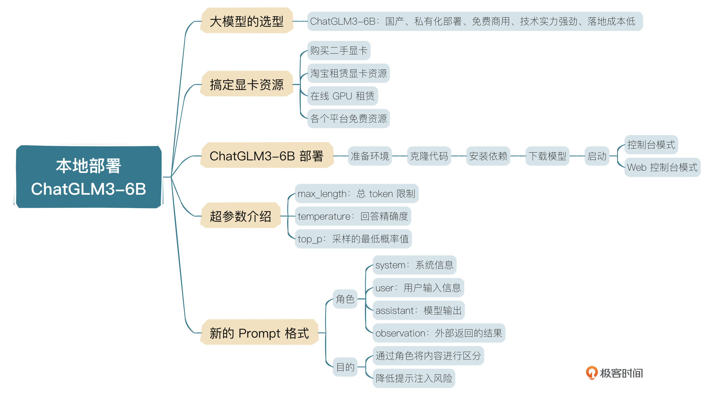 这节课我们学习了如何部署6B。从模型的选择到环境配置再到模型启动、推理,整体来说已经比较全面了,如果你在实际操作的过程中遇到环境问题,可以自己Google一下尝试去解决。毕竟每个人的环境不一样,可能会遇到各种各样的问题,主要还是Python相关的多一些。如果这一节课有些内容你没有看懂也不用急,先把模型部署及推理这一块熟悉一下,后面我们会逐渐深入地讲解。