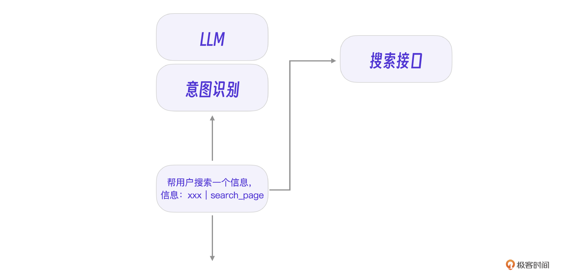 你看,图中的 search_page 就是大模型意图识别后给我们返回的标识,这表明大模型需要我们的专有程序去处理 search_page 任务,获取数据后再次提交给大模型处理用户请求。