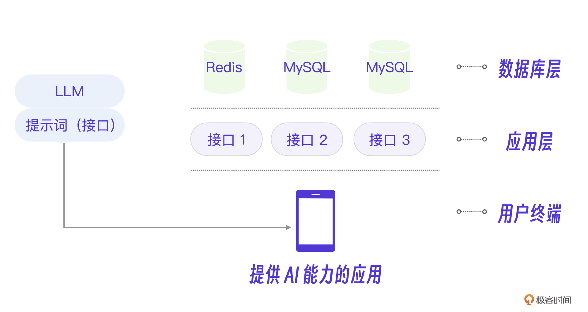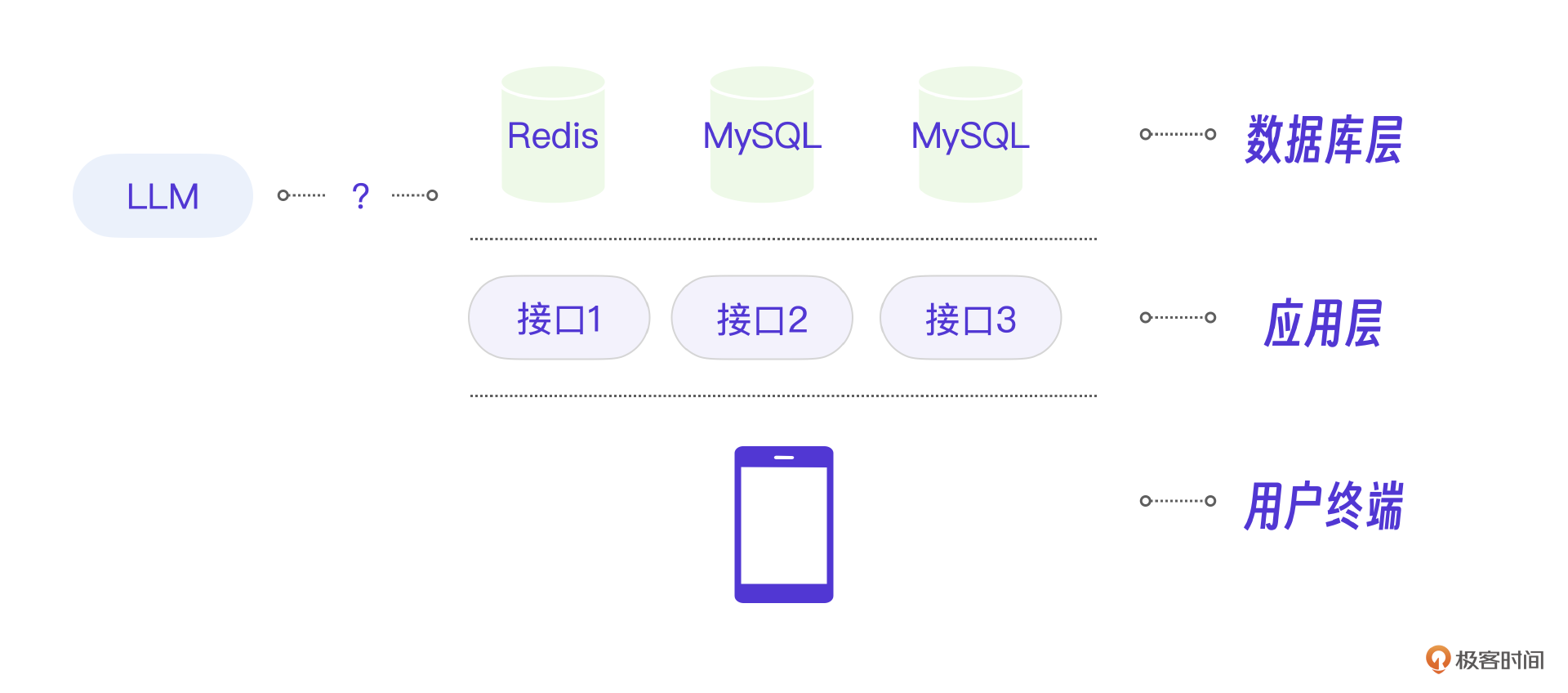 想要了解清楚大模型在应用开发中的角色,我们需要先从传统的互联网开发架构谈起。如下图所示,传统的互联网开发架构分为数据库层、应用层和用户终端层。