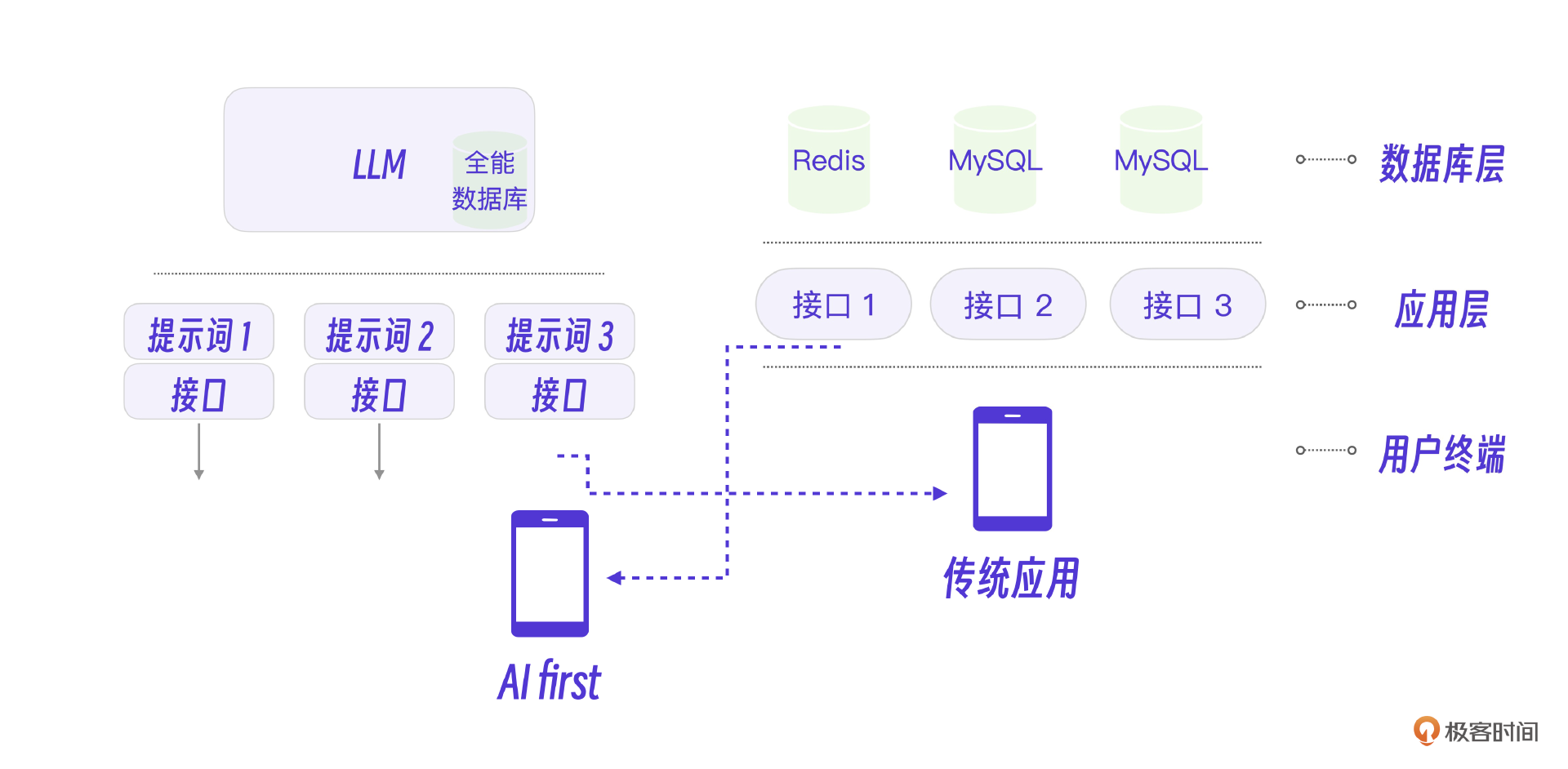 回顾一下最终整理的大模型AI智能体应用开发架构图,我们会发现传统互联网架构、传统应用、大模型、提示词、微调、AI first应用之间的关系其实是比较清晰的。从分层的角度对比来看,AI大模型和数据库是一层的,提示词和传统接口是一层的,AI应用属于应用层。