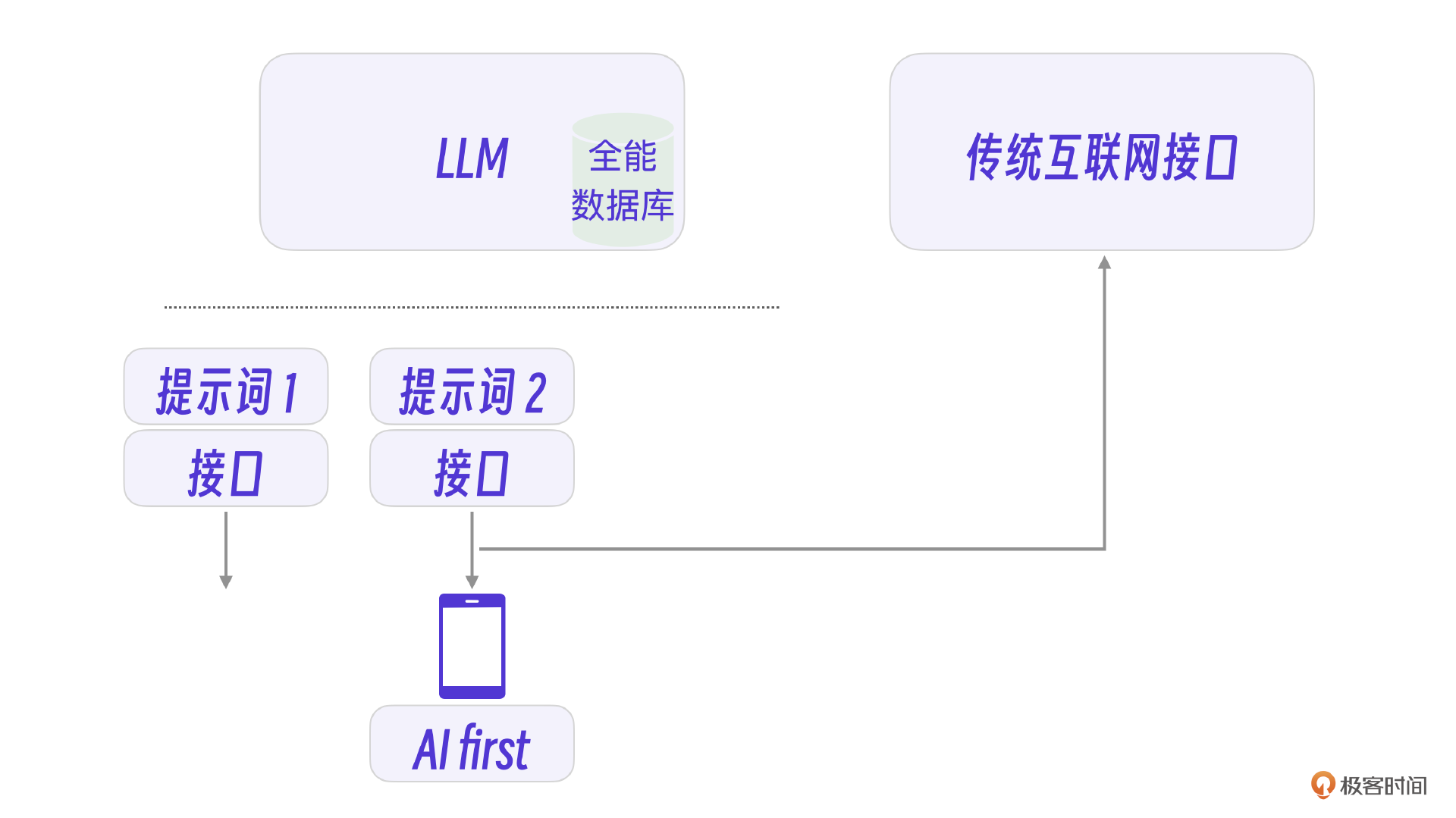 比照互联网架构图中的传统互联网架构,传统架构下的接口是一个分而治之的逻辑,一个接口完成一个专有逻辑。大模型的接口是一个全能逻辑,但却可以实现所有细分的专用能力,具体实现要靠提示词工程。