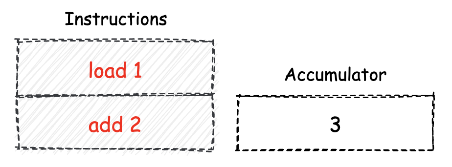 此时,累加器中保存的数值为 1。继续,机器执行第二条指令 “add 2”。该条指令会将其后面跟随的立即数,累加到机器的累加器单元中。当最后一条指令执行完毕后,累加器机的终态将如下图所示。此时,累加器中便存放着表达式 “1 + 2” 的计算终值 “3”。