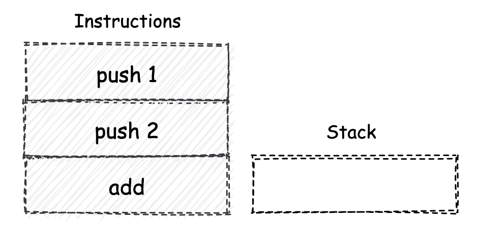 接下来,我们将尝试模拟堆栈机的实际运行流程。在这个过程中,我们会使用到一些简单的指令,比如 “push”,“pop” 与 “add” 等等。这里你可以把它们想象成一种汇编指令。