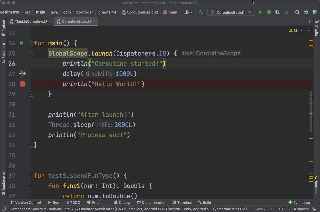 除了设置VM参数之外,我们还可以直接使用IDE的调试功能,直接以打断点的形式来调试协程。具体来说,主要有这样几个注意事项。