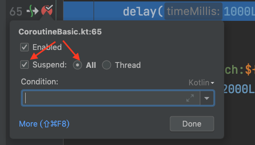 第三步,为协程代码打断点,并且右击断点处,勾选suspend、All,这代表了我们的断点将会对协程生效。具体可以参考我下面的截图: