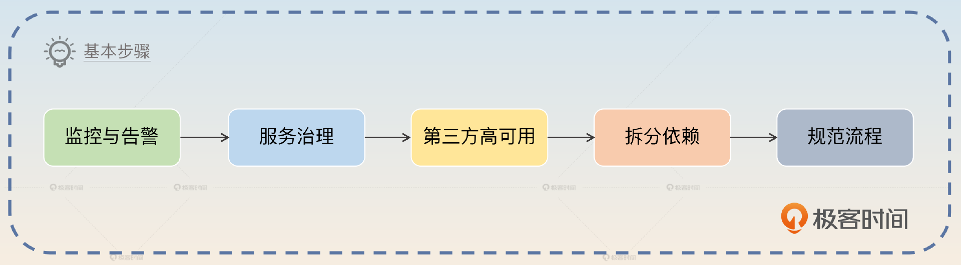在第一个步骤里面,就监控来说,既要为业务服务添加监控和告警,又要为第三方依赖增加监控,比如说监控数据库、Redis 和消息队列。而告警则要综合考虑告警频率、告警方式以及告警信息的内容是否足够充足,减少误报和谎报。本身这个东西并不是很难,就是非常琐碎,要一个个链路捋过去,一个个业务查漏补缺。
