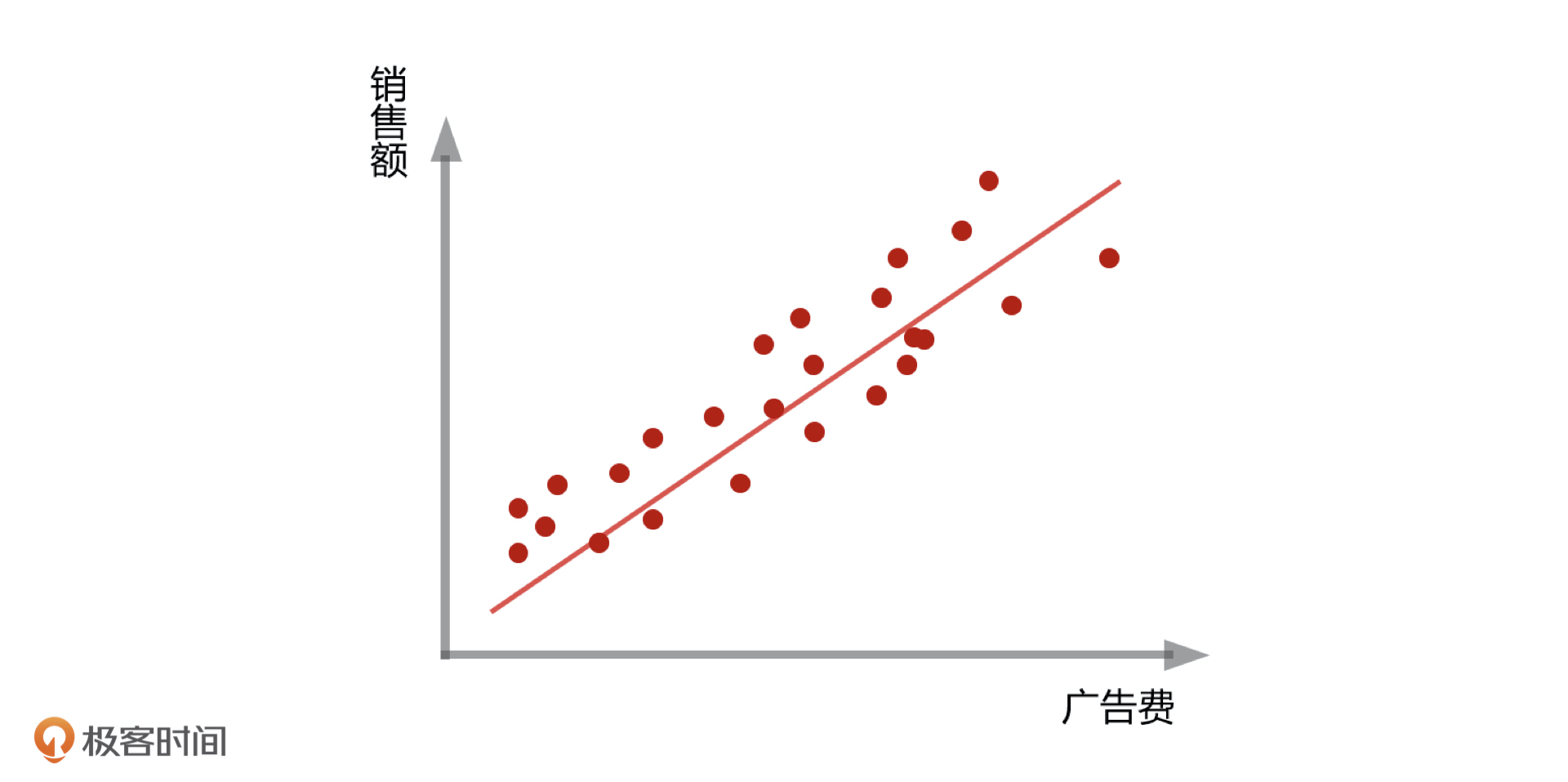 到这里,我们已经明白线性回归算法到底是怎么操作的了。为了把它更好地应用到实际问题中,我再结合一个预测广告的例子,来给你讲讲这个算法到底能用来解决什么问题。