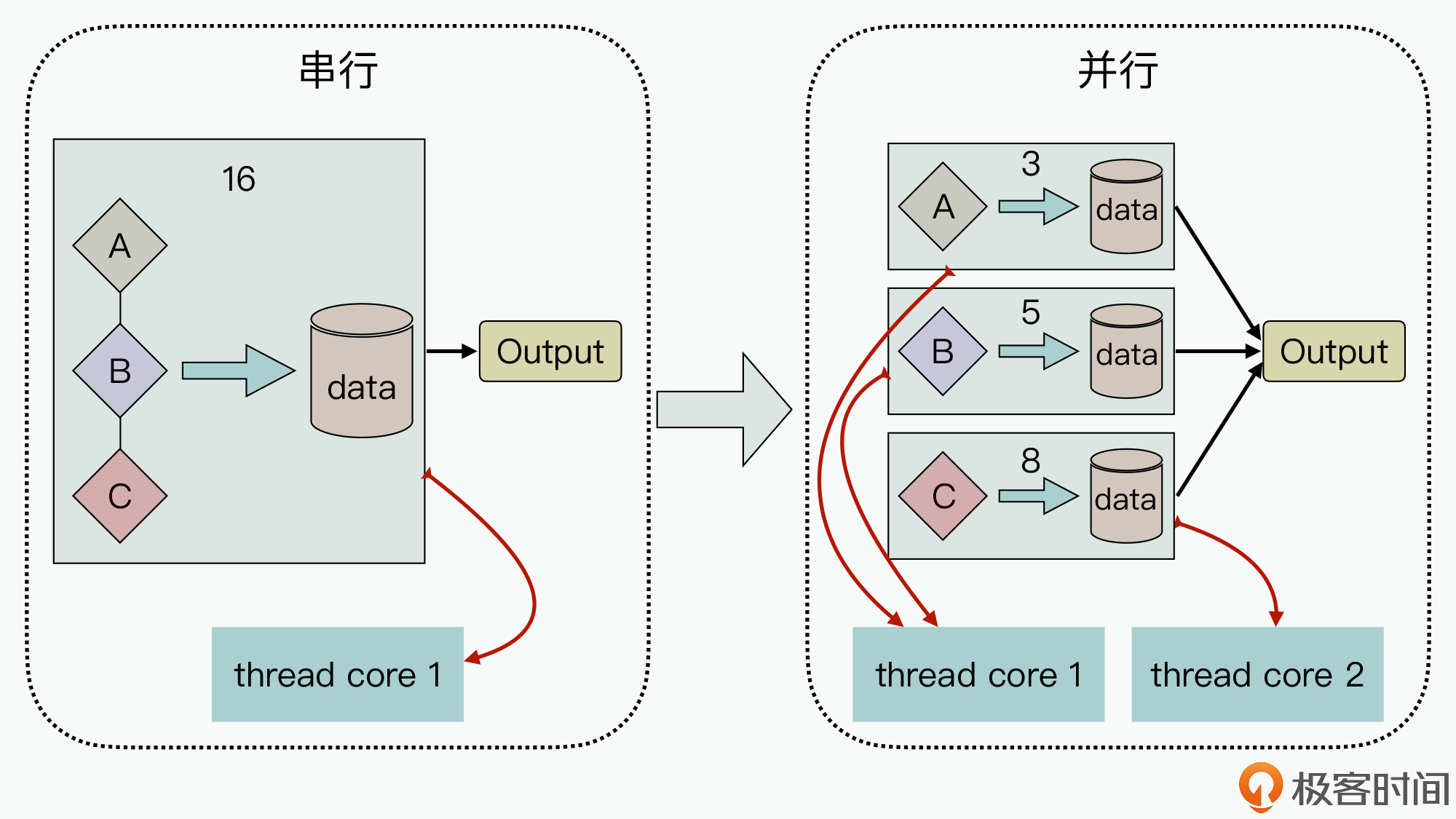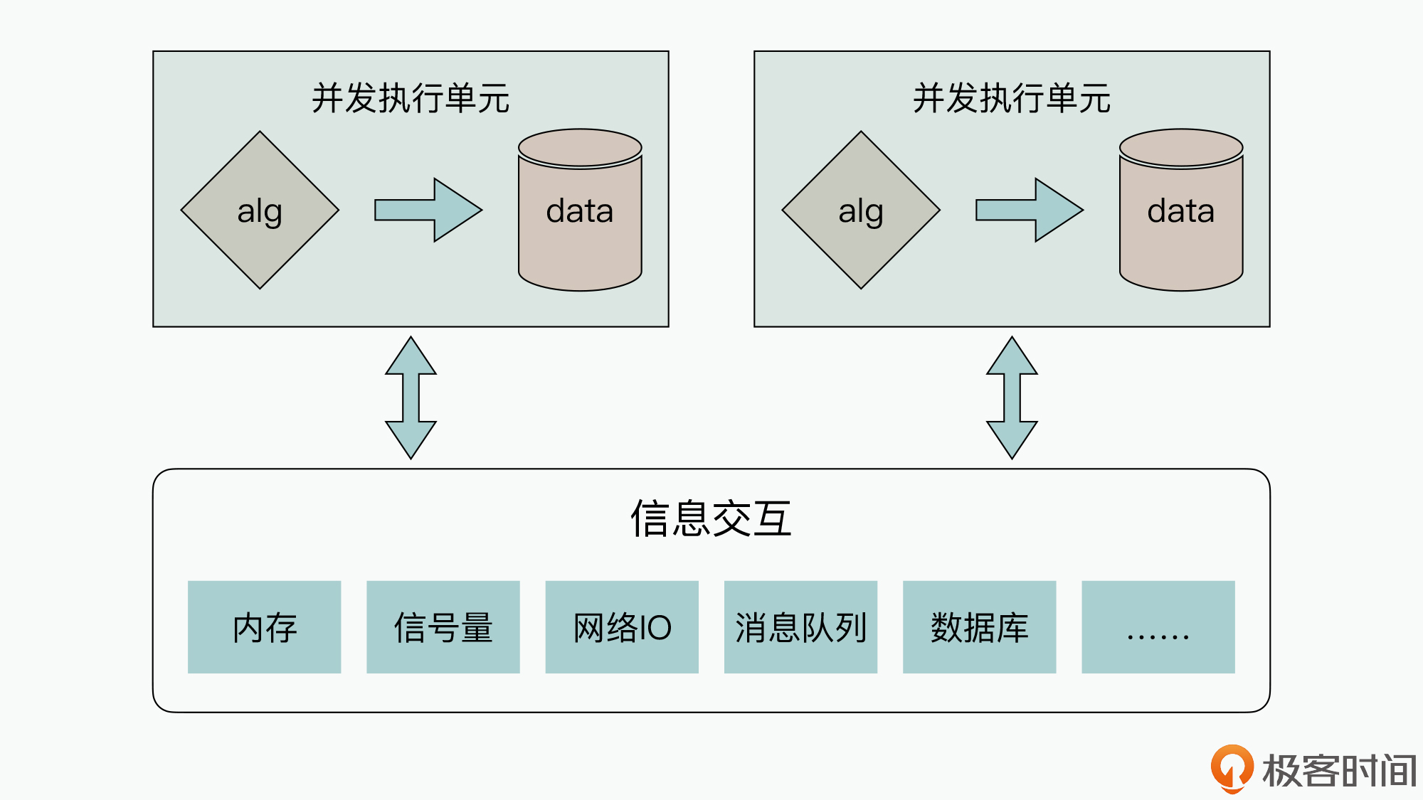 这里你要注意的是,图中的两个并行执行单元代表了抽象的逻辑单元,并不是特指线程。并行执行单元的粒度可大可小,像函数、routine(协程)、actor、线程、进程、作业等,都可以作为并行执行单元。