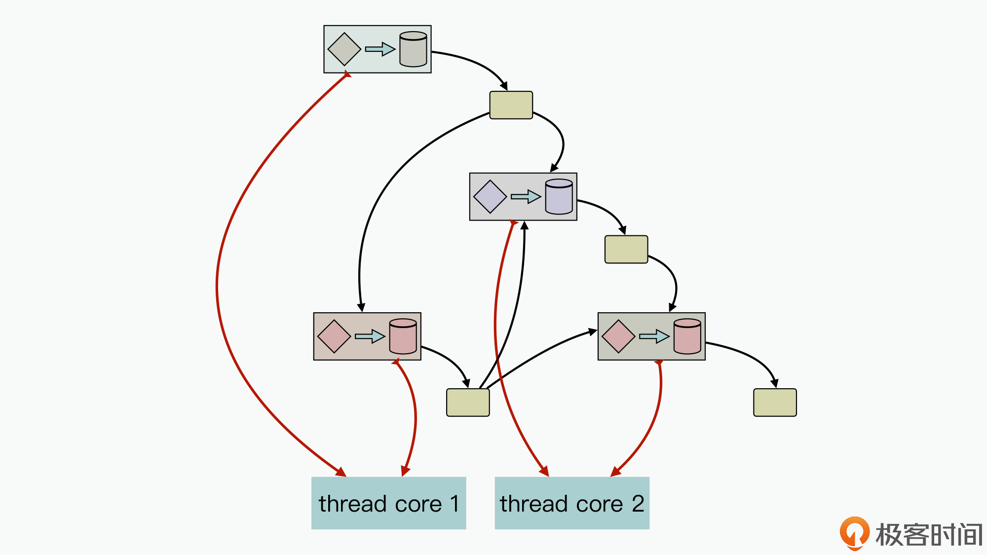 这里请注意,要想最大化地发挥这种架构的性能,还需要实现一点:并行执行单元能够动态灵活地映射到特定的硬件CPU核上。比如说,Node.js后端业务async和Java语言中的Future并发机制,都是比较好的支撑异步交互架构的语言机制。