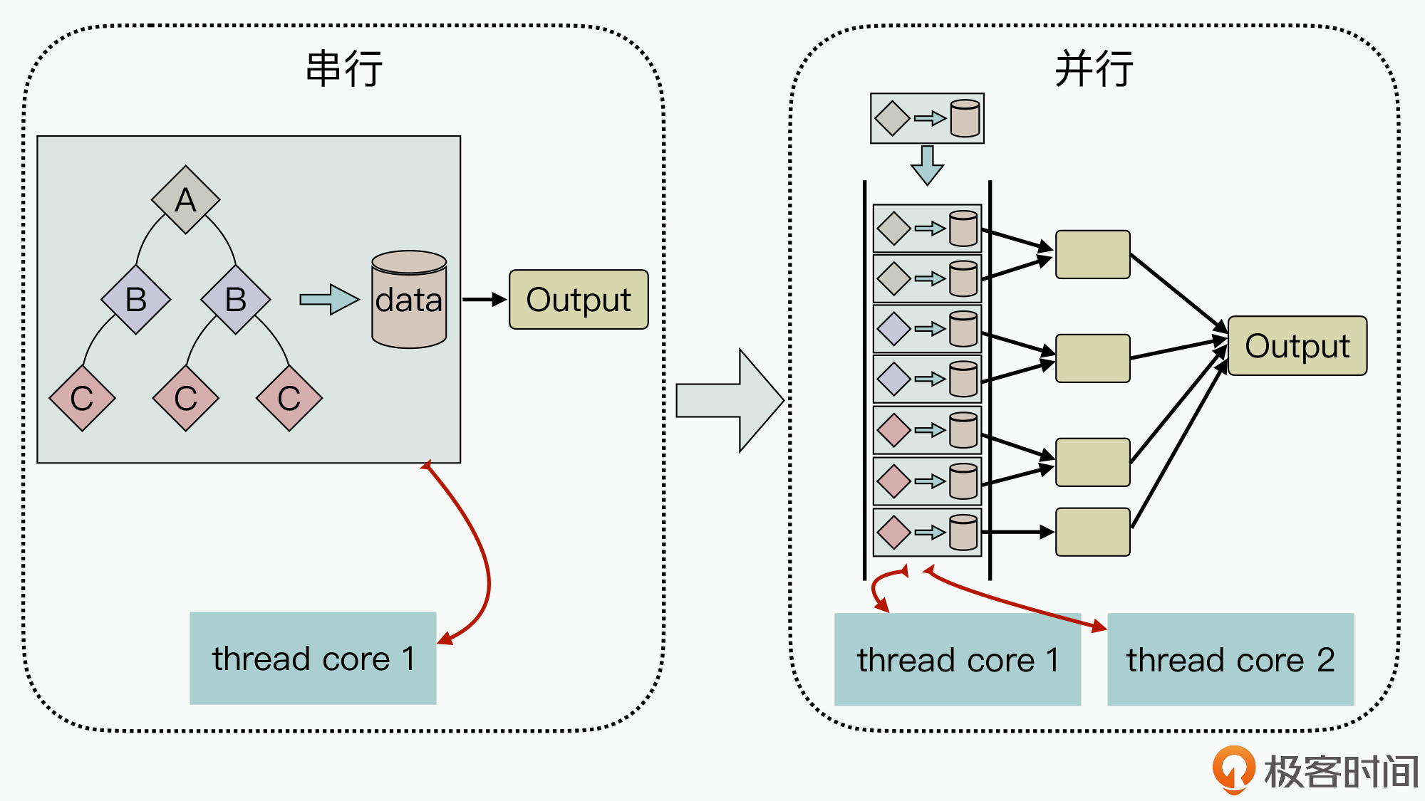 除此之外,在介绍6种并行设计架构模式的过程中,我还会给你重点强调下该架构模式中的隐式约束条件。只有充分理解了这些约束条件,你才能在并行设计的过程中,避免引入一些故障,也能够降低代码开发的实现复杂度,并最大化地挖掘这种并行设计架构模式的性能。