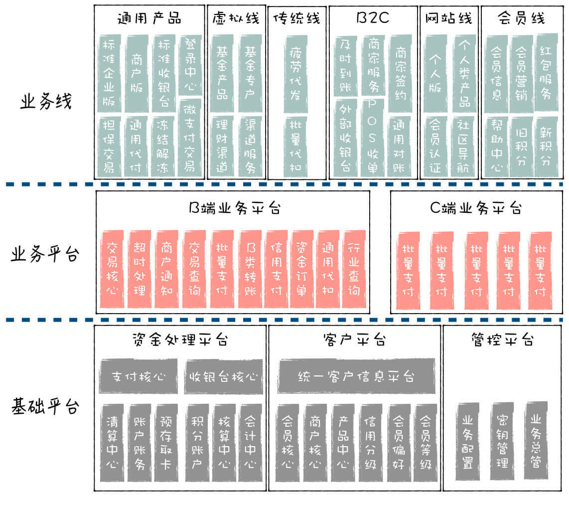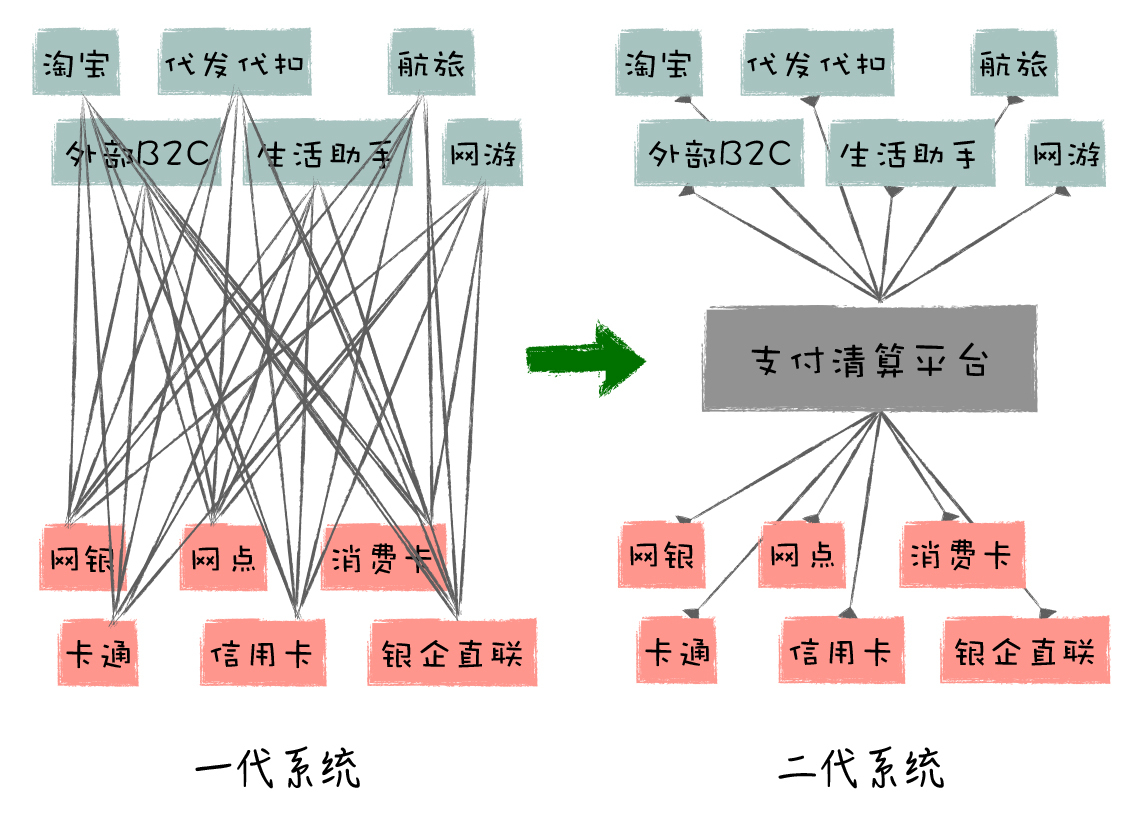 而在支付宝二代业务架构中,你会发现,他们在前后台业务线之间,构建了独立的支付清算平台,从而实现了前台业务和后台业务的解耦。
