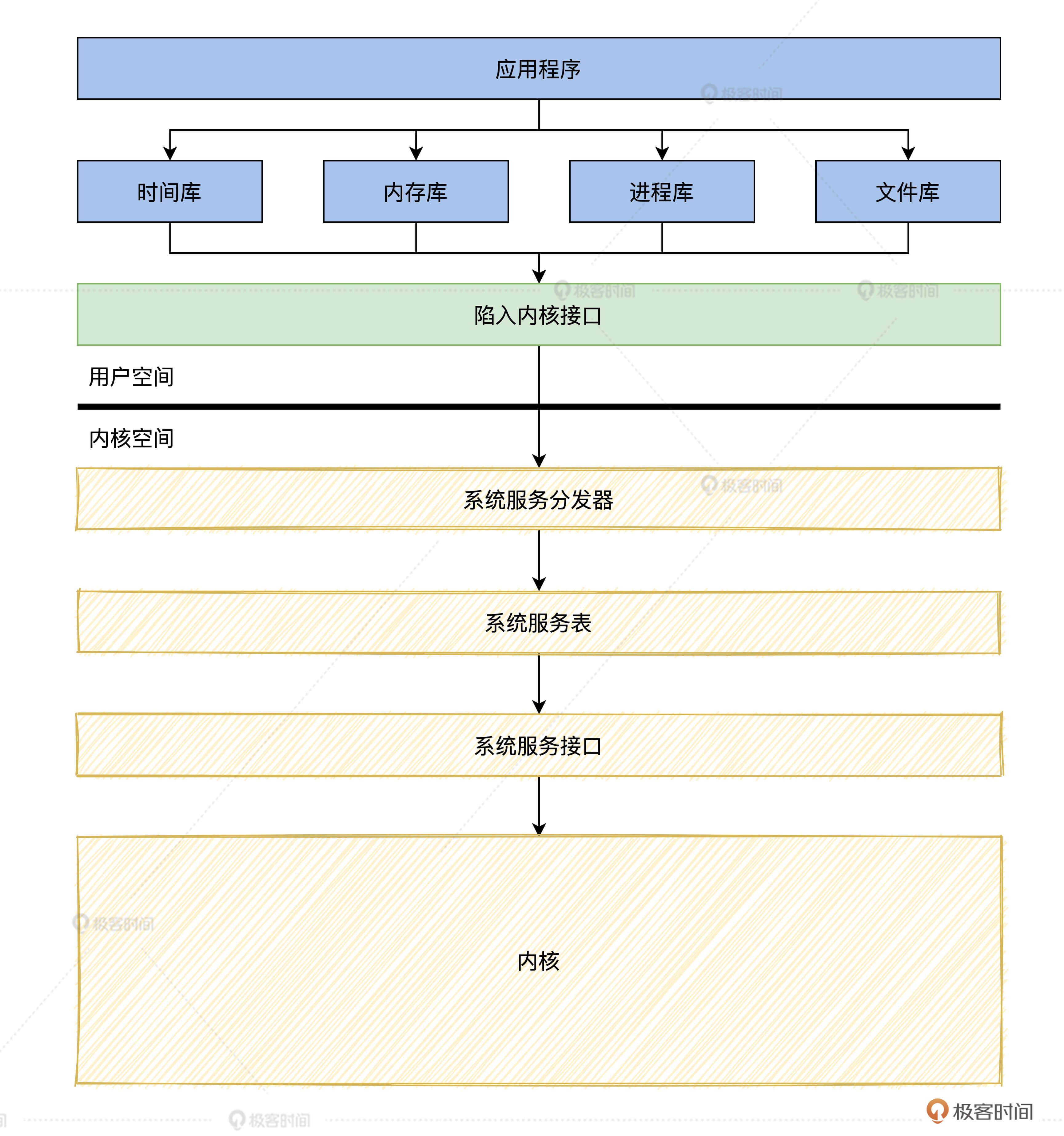 我们已经实现了一个获取时间的系统服务函数,我想你应该能自己实现其它更多的系统服务函数了。下面我来帮你梳理一下,从库函数到进入中断再到系统服务分发器,最后到系统服务函数的全过程,我给你准备了一幅图,如下所示。