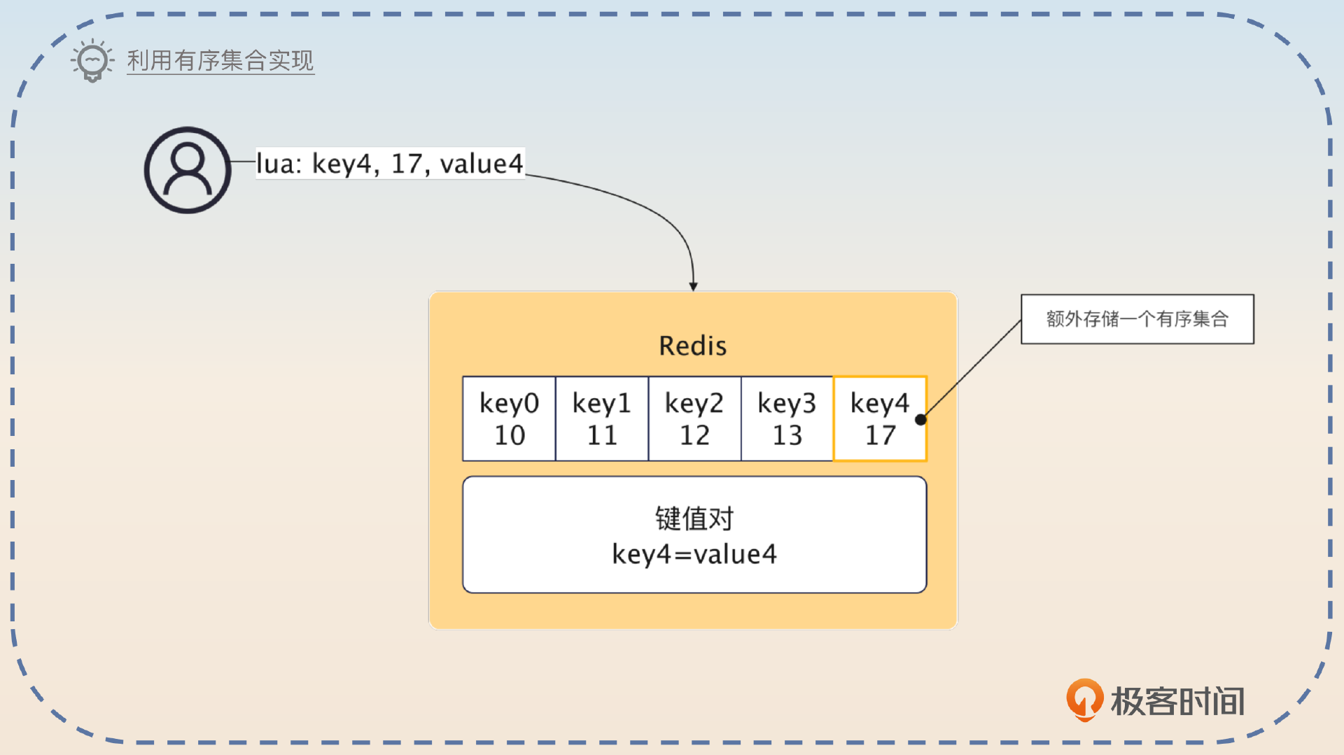 最后我提出了一个针对业务特性来设计的按照优先级淘汰的算法,根据怎么计算优先级又可以进一步细分成大对象先淘汰、小对象先淘汰、根据热度来淘汰。这些方案在 Redis 上落地的时候,都需要借助 Redis 的有序集合,而且为了避免并发问题,你操作 Redis 的时候都是要通过 lua 脚本封装一系列操作的。