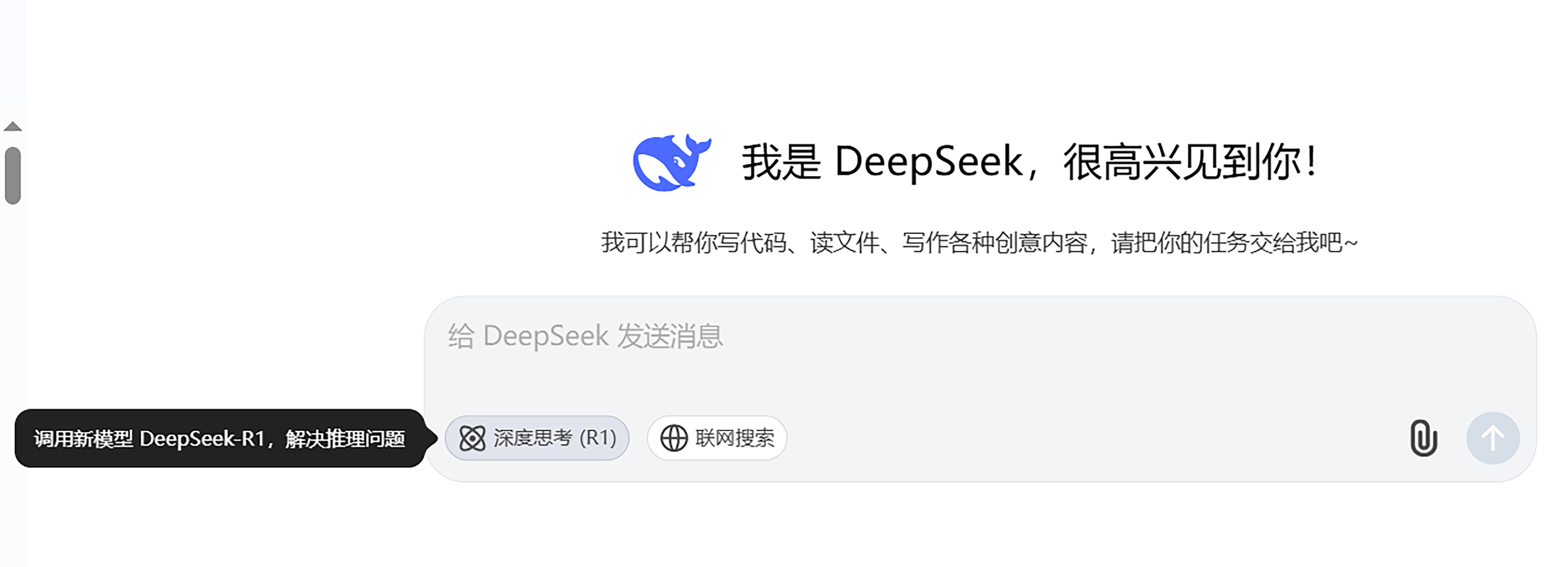 再使用过对话功能后,大家会发现,DeepSeek-R1 基本在第二轮提问时,就会出现如下回复。