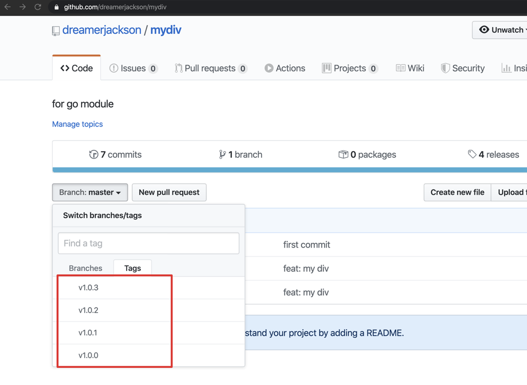 假设现在项目D(即github.com/dreamerjackson/mydiv的最新版本)为v1.0.3 ,模块可用的版本号可以通过下面这个指令查看: