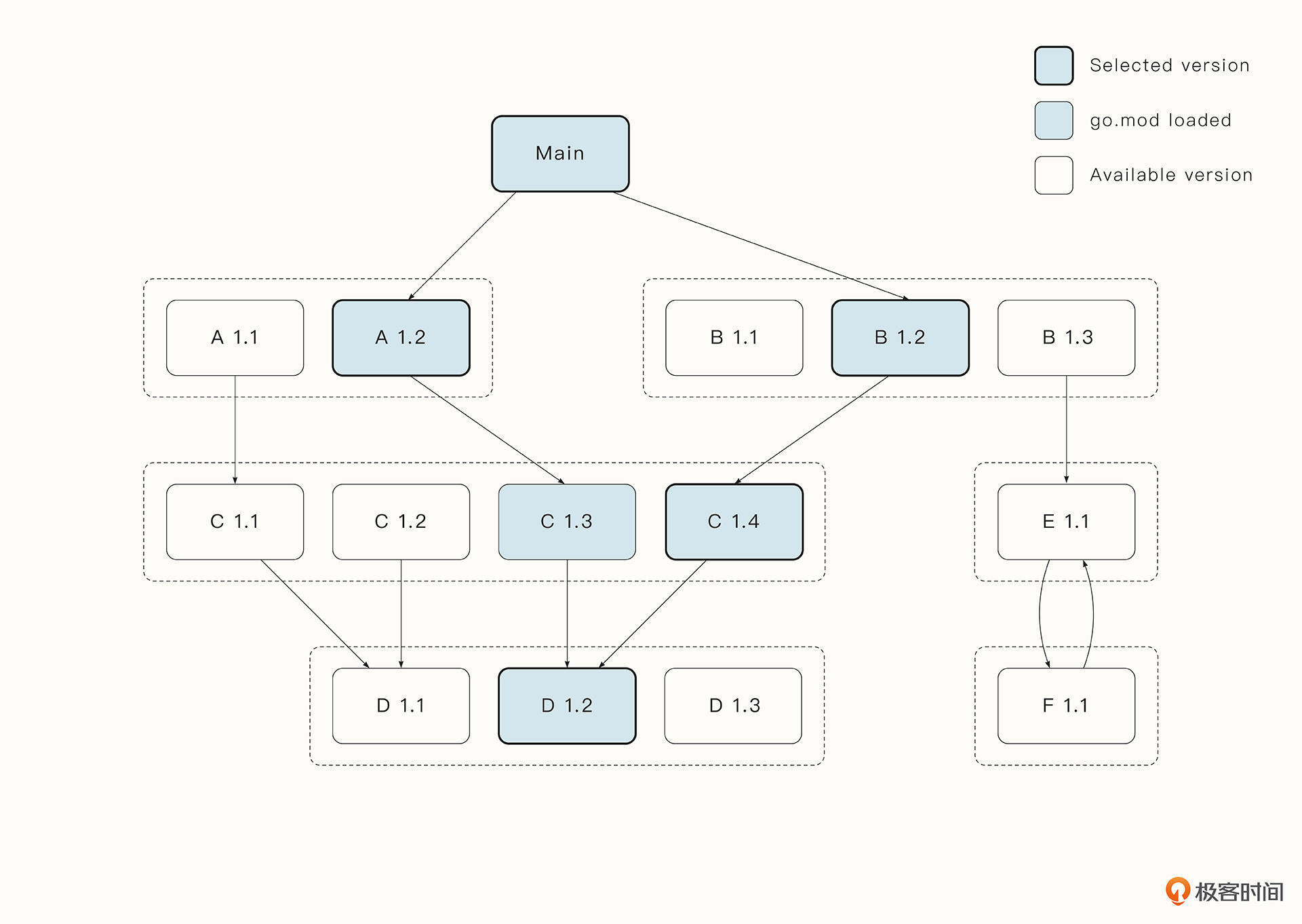 明白了Go Modules的使用方法,接下来我们来看一看Go Modules在复杂情况下的版本选择原理。