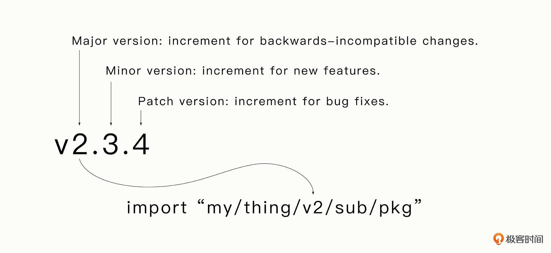为了标识一个模块的快照,Go Modules使用了语义版本来管理模块。每个语义版本都采用vMAJOR.MINOR.PATCH的形式,我们简单介绍下各字段的含义。