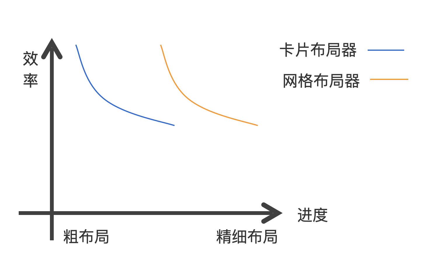 显然不是的。你看下上面这张图,随着布局越来越精细,一次操作可以影响到的界面面积越来越小。比如对一个卡片内部进行精细布局所需的操作次数,与对页面整体进行布局所需的次数可能还要更多。也就是说,对卡片内部的布局操作而言,相同布局操作的性价比就非常低了。