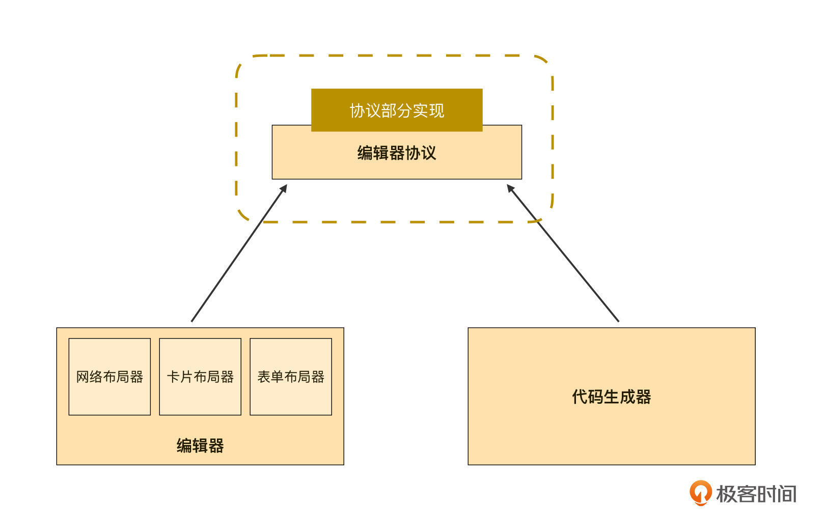 这个阶段,代码生成器与编辑器之间没有直接耦合。它俩各自与编译器协议产生耦合,布局器是编辑器的一部分。在这个架构下,只要各种布局器能严格遵守编译器协议来实现,那代码生成器就可以识别各个布局器的布局输出。