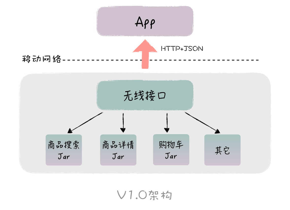 这个架构比较简单,App的服务端整体上就一个应用,由移动团队来维护所有对外接口,服务端内部有很多Jar包,比如商品搜索、商品详情、购物车等等,这些Jar包包含了各个业务线的业务逻辑及数据库访问,它们由各个业务线的开发者负责提供。