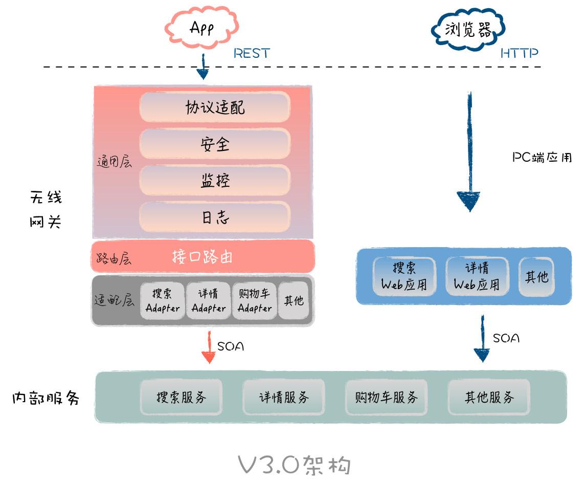 我们知道,当App发展到一个成熟阶段时,无论是业务功能,还是非业务性功能,和PC端都是不同的。所以,在架构设计上,我们必须能够支持它们各自不同的特点,根据这个思路,我们的App服务端架构也演变到了V3.0版本。