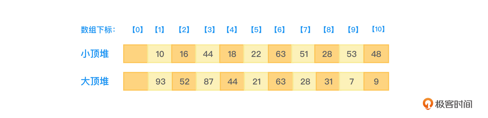 图3所示的小顶堆和大顶堆所对应的存储数组就应该如图4所示: