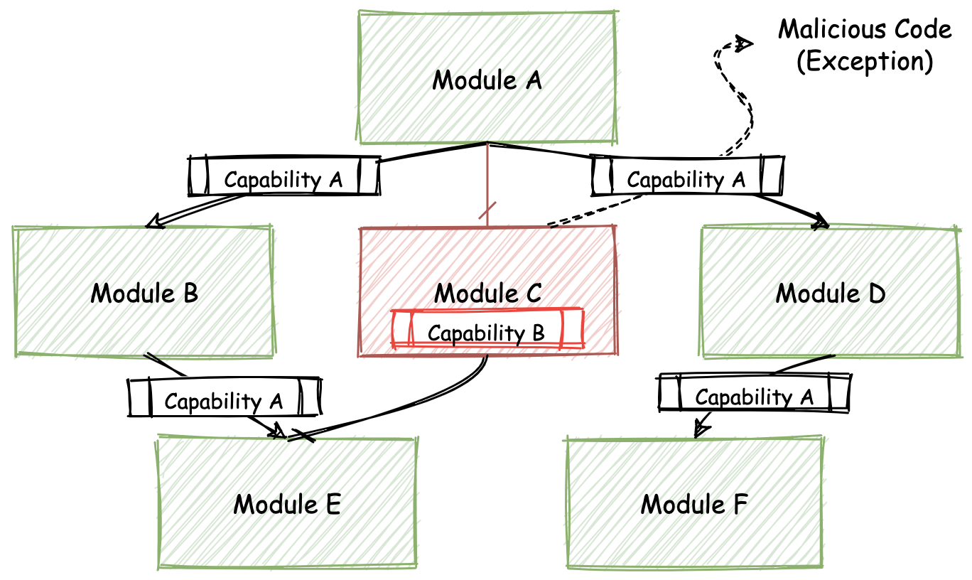 当一个含有恶意代码的 Wasm 模块被“链接”到整个应用的依赖树中时,应用各依赖模块所能够使用的资源及系统接口权限,便全部来自于最上层的调用者。也就是说需要在应用运行的入口模块中被指定,然后再由该模块向下层依赖模块进行分发。