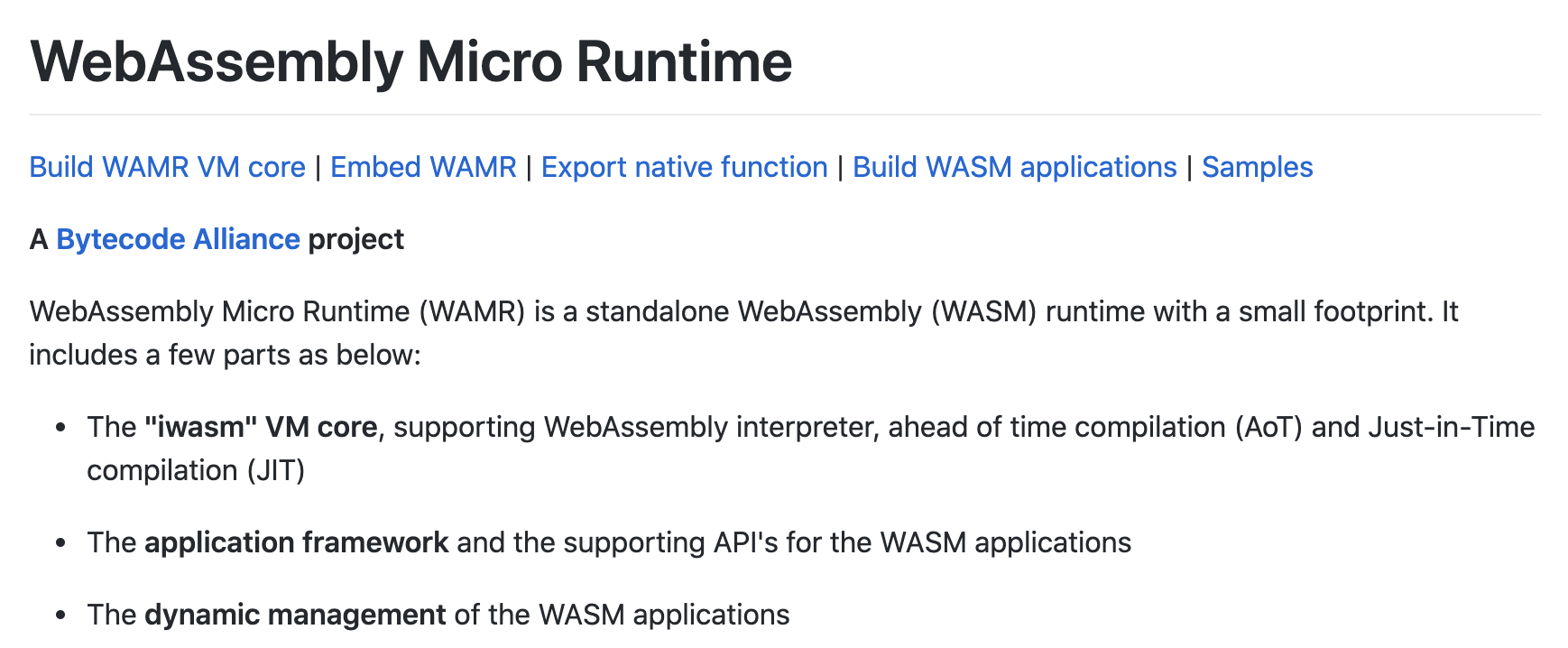 WAMR(WebAssembly Micro Runtime)同样是一款字节码联盟旗下的独立 Wasm 运行时,它基于 C 语言开发。不过相较于 Wasmtime,它更倾向于被应用在诸如 IoT、嵌入式芯片等对功耗和硬件资源要求较为严格的 Wasm 场景中。