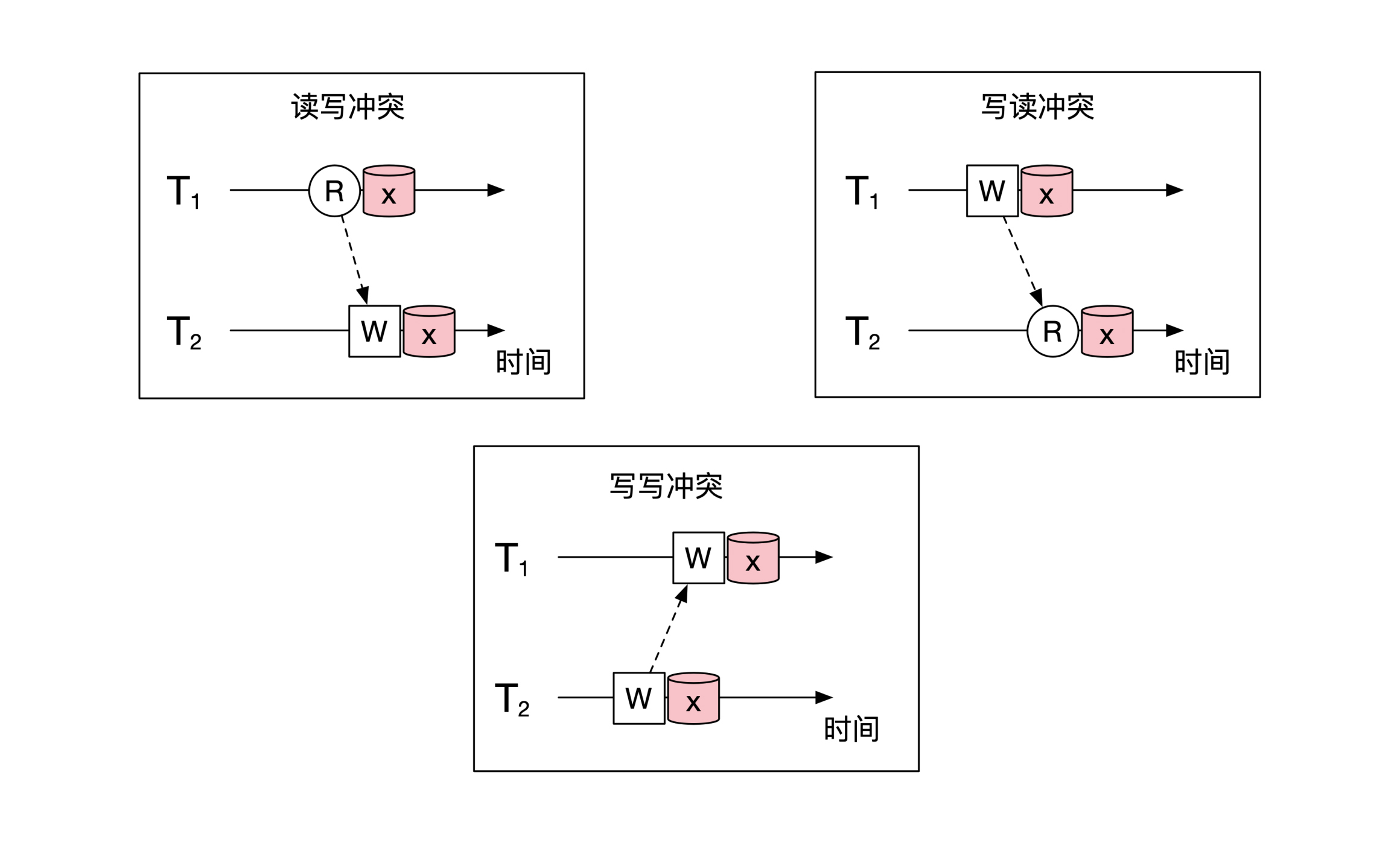如果两个操作对应的是不同的对象,那么这两个操作不会有任何冲突。所以两个操作**如果要有冲突,一定是它们操作了同一个对象。**另外,如果两个操作都是读操作,也不会出现任何冲突。