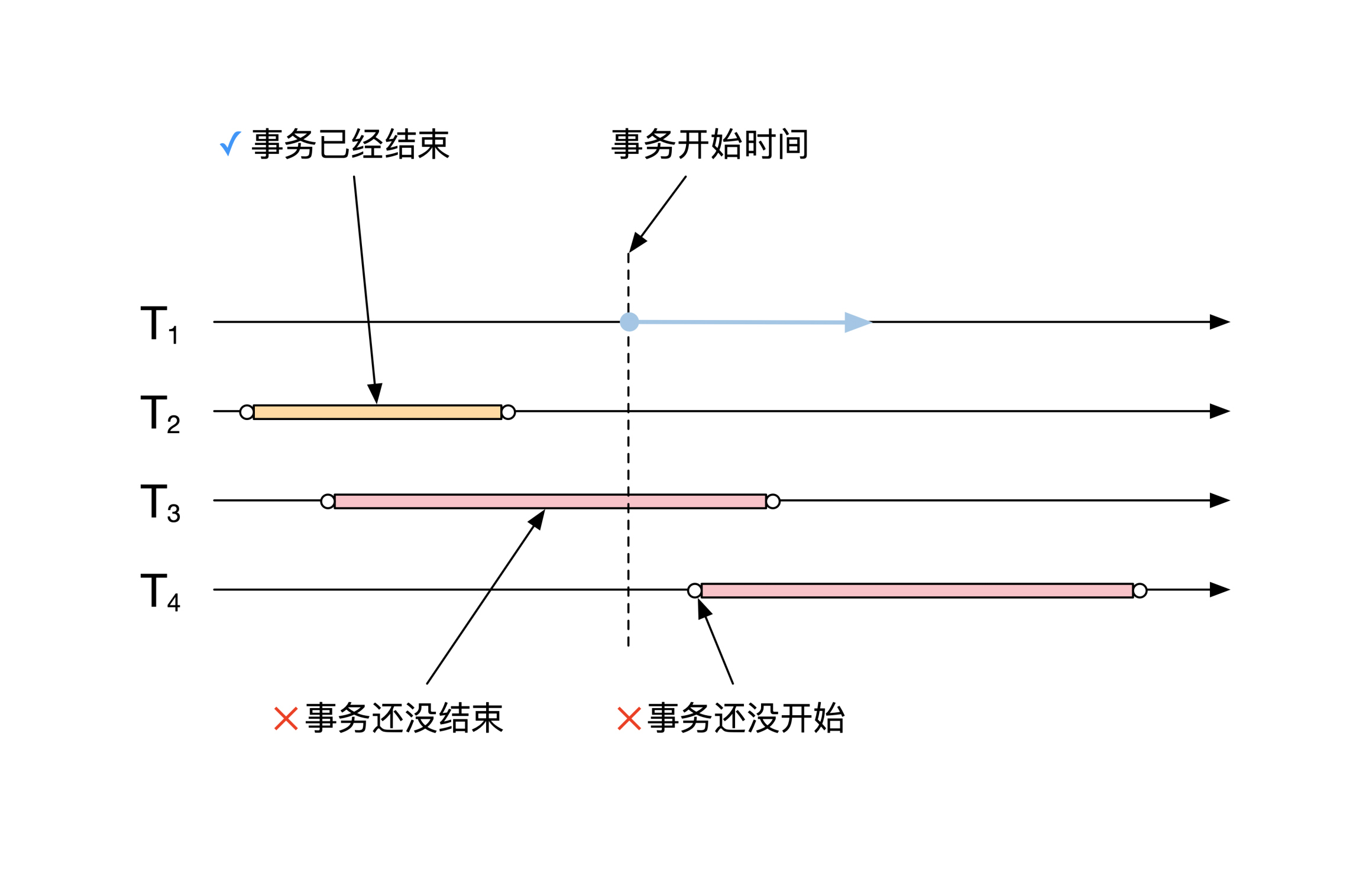 你可能有个疑问,为什么我们需要忽略还没有开始的事务呢?这是因为当事务开始运行之后,还会有新的事务会陆陆续续进来,这些新来的事务对应的数据不应该包含在快照之内,所以也需要排除。