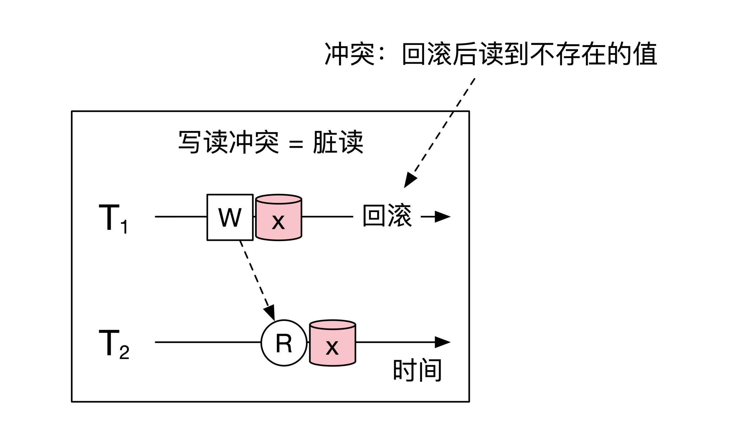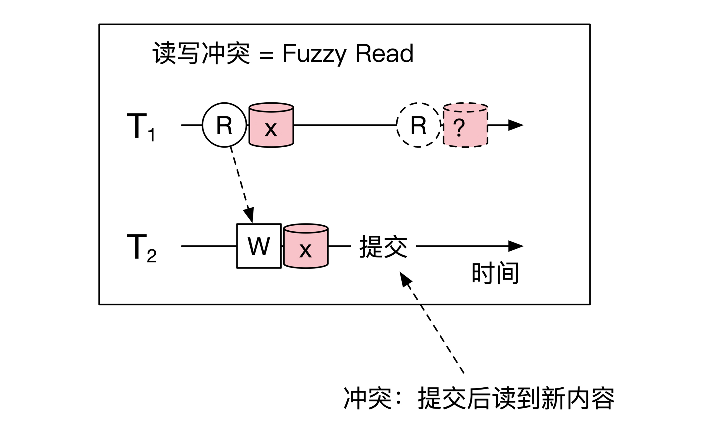 原因是读的事务如果再读一次的话,会将另一个事务写入的值读回来,因此前后两次读到的结果会不一致。示意图如下:
