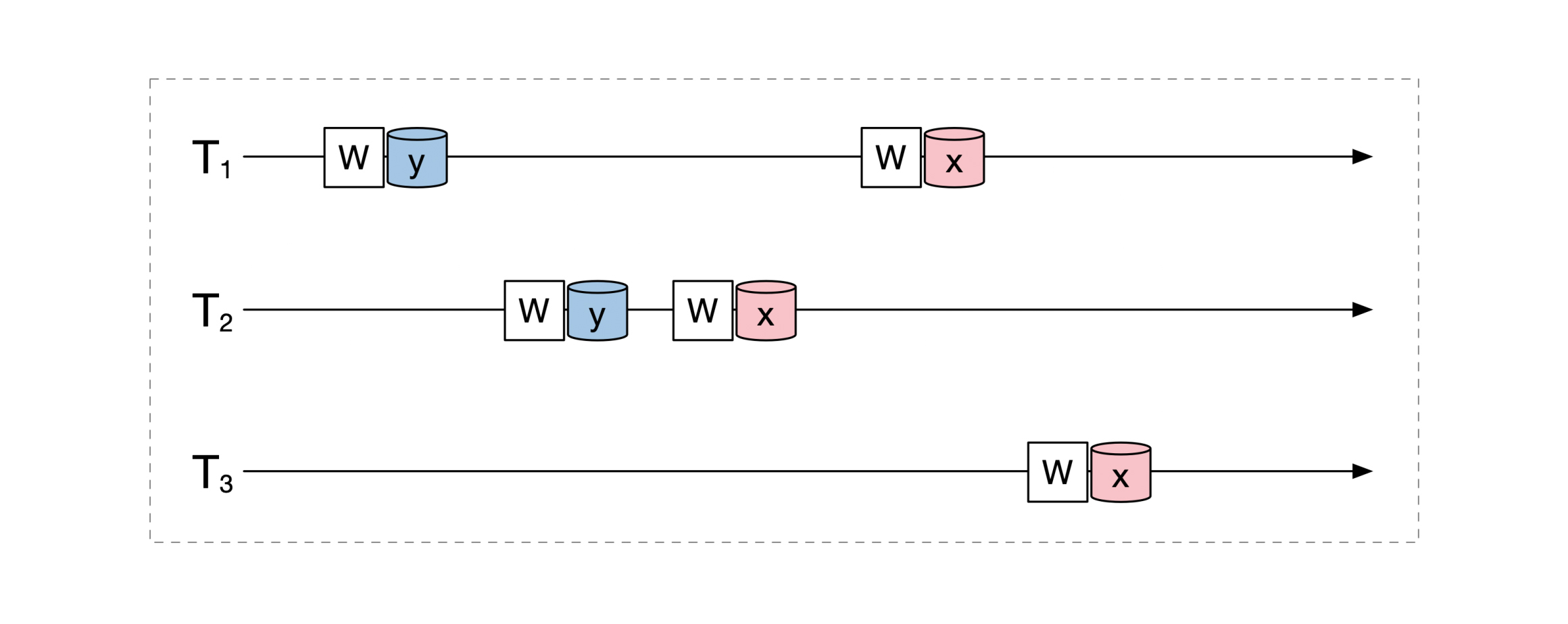 我们还是来举个例子。系统中有3个事务,它们的操作之间的时间关系如下图: